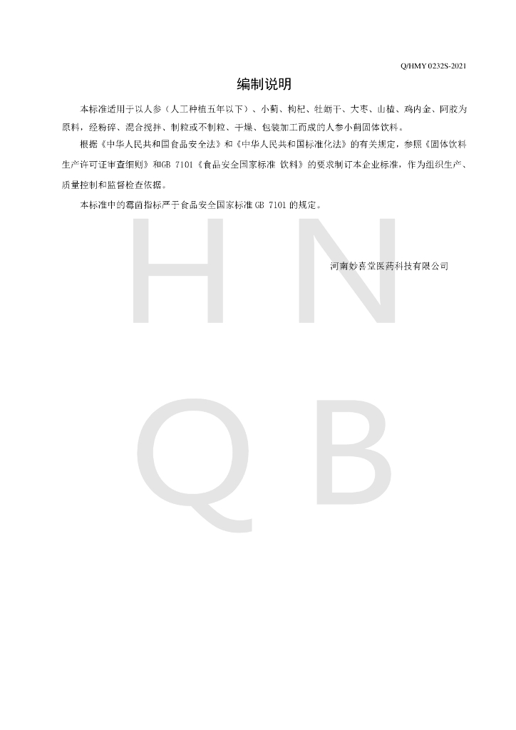 Q/HMY 0232S-2021 人参小蓟固体饮料