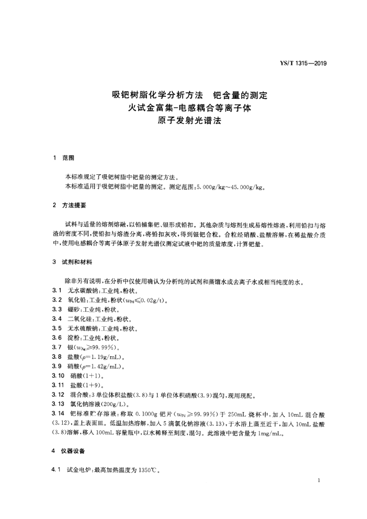 YS/T 1315-2019 吸钯树脂化学分析方法 钯含量的测定 火试金富集-电感耦合等离子体原子发射光谱法
