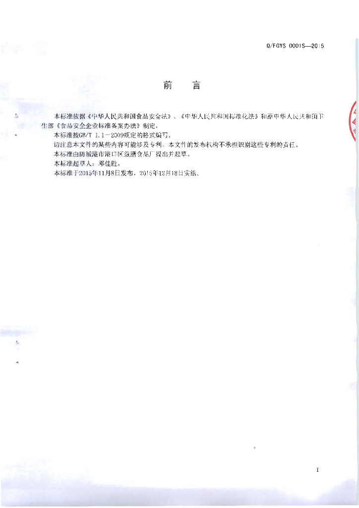 Q/FGYS 0001S-2015 防城港市港口区益膳食品厂 食用小麦调制鲜湿米粉