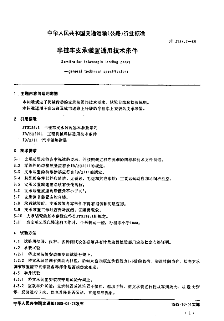 JT 3138.2-1989 半挂车支承装置通用技术条件