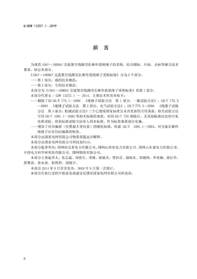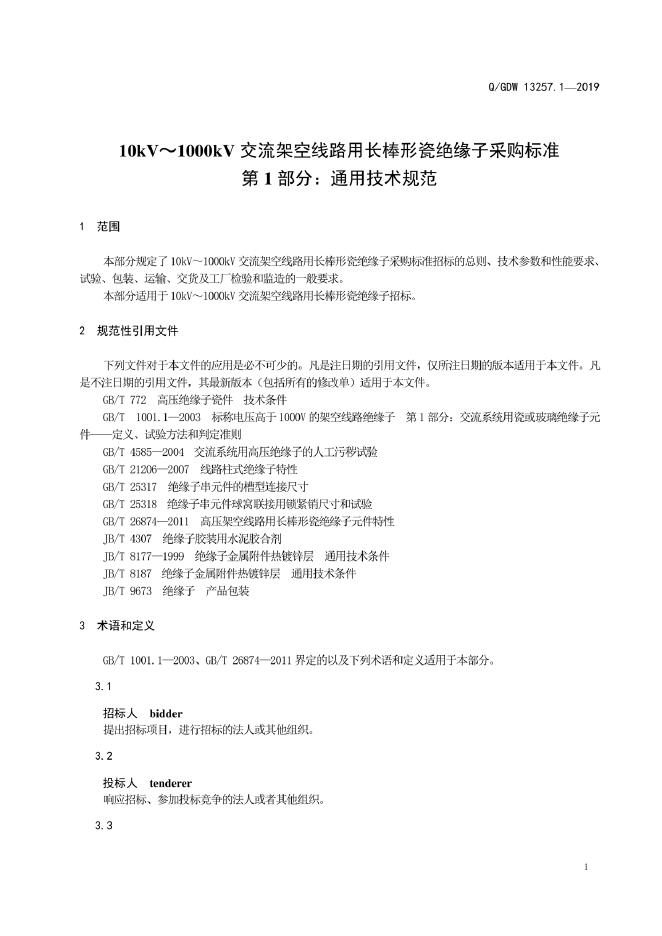Q/GDW 13257.1-2019 10kV~1000kV交流架空线路用长棒形瓷绝缘子采购标准 第1部分:通用技术规范