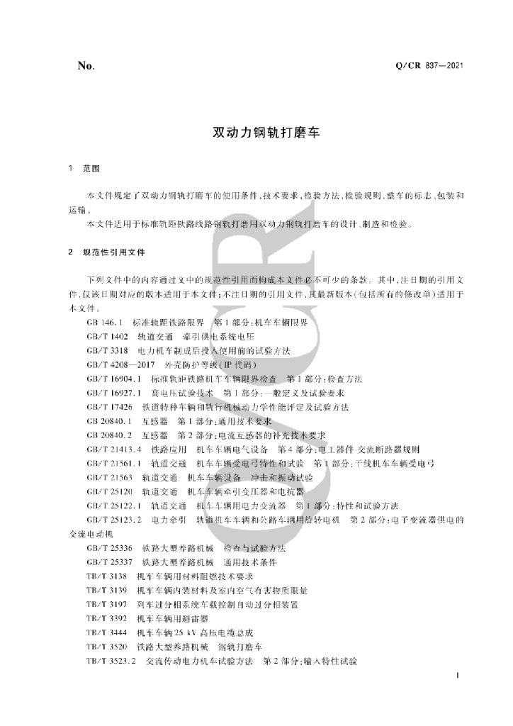 Q/CR 837-2021 双动力钢轨打磨车