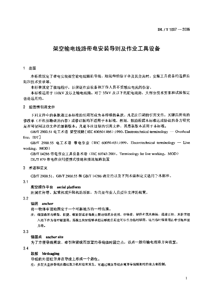 DL/T 1007-2006 架空输电线路带电安装导则 及作业工具设备