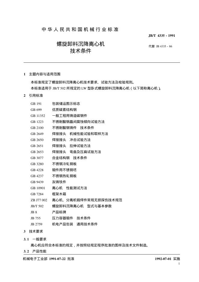 JB/T 4335-1991 螺旋卸料沉降离心机 技术条件