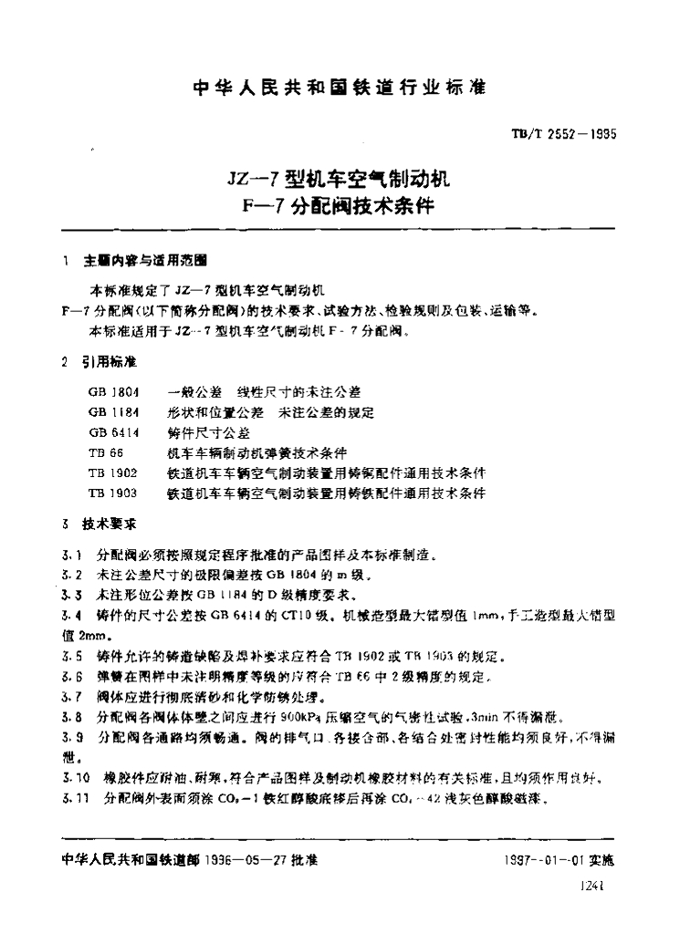 TB/T 2552-1995 JZ-7型机车空气制动机 F-7分配阀技术条件