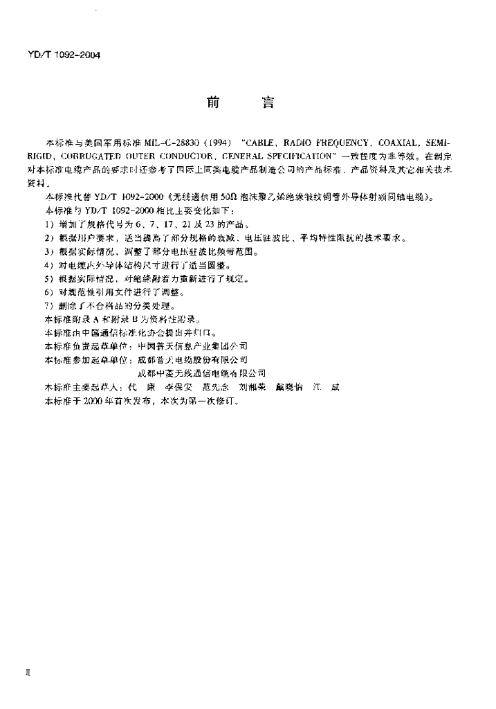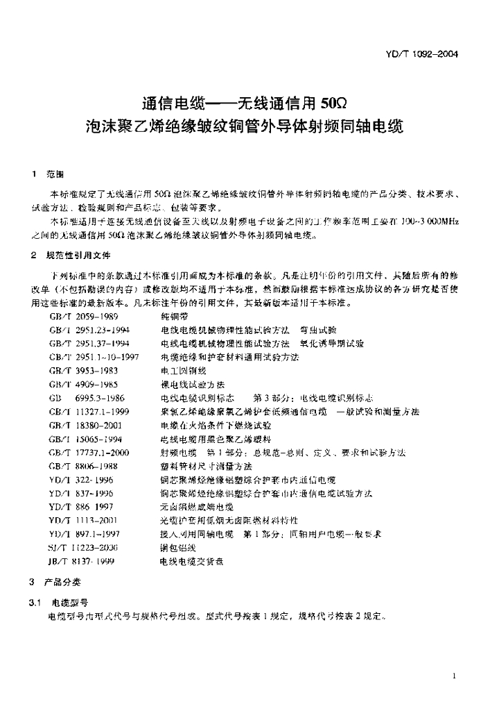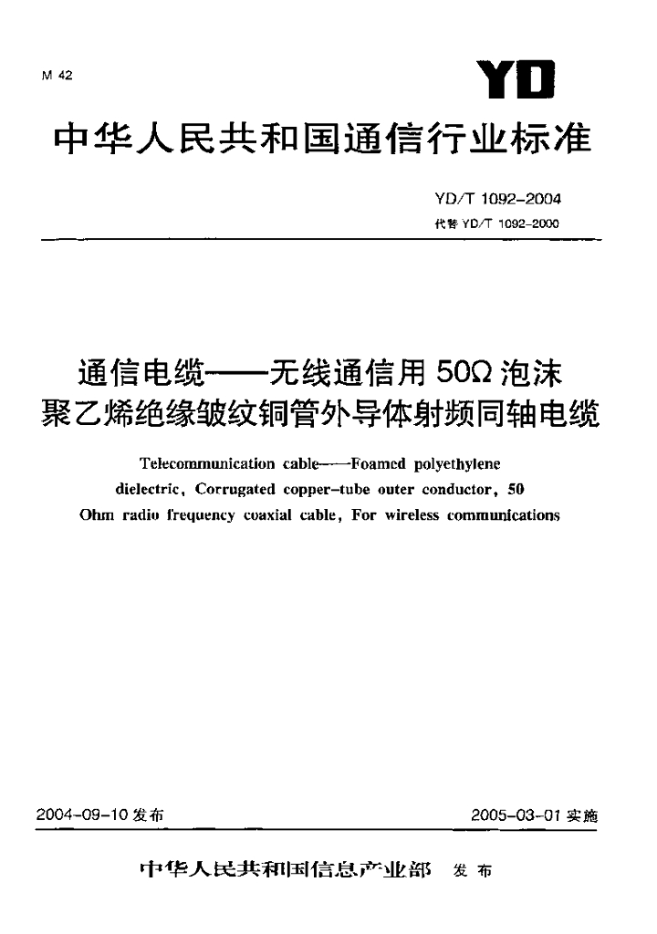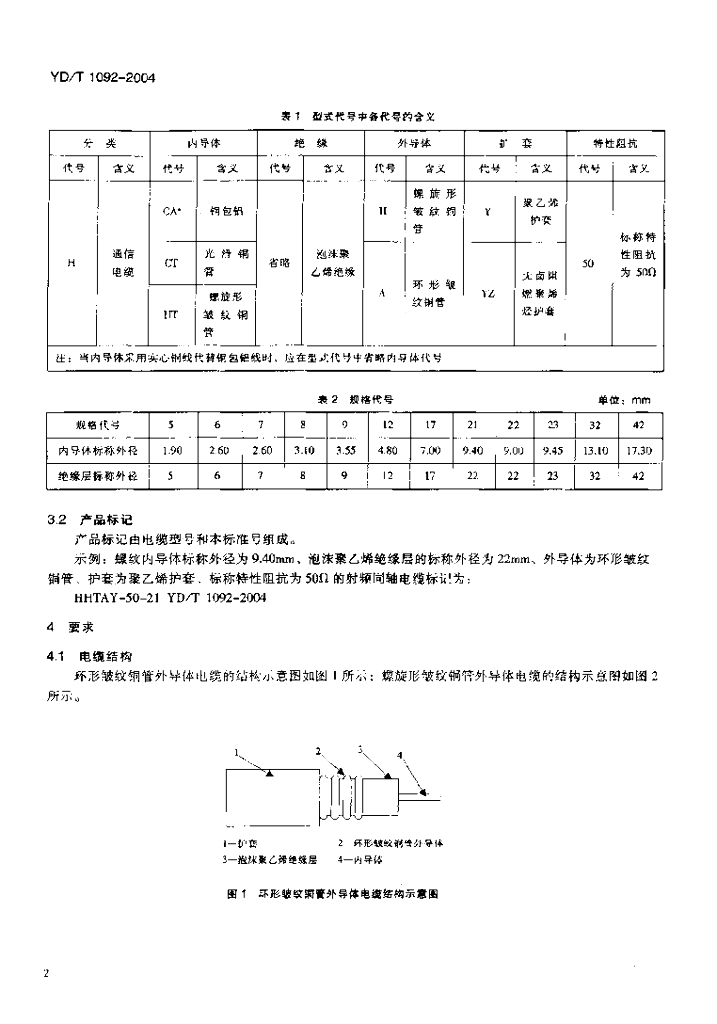 YD/T 1092-2004 通信电缆——无线通信用 50Ω 泡沫聚乙烯绝缘皱纹铜管外导体射频同轴电缆
