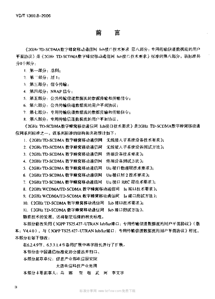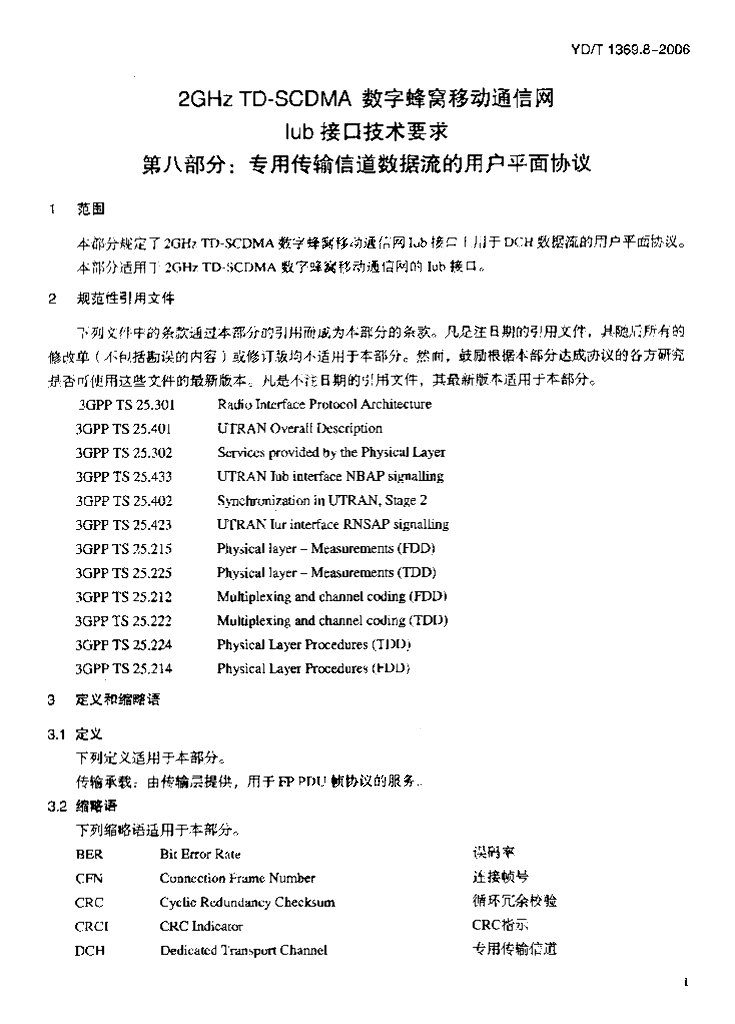 YD/T 1369.8-2006 2GHz TD-SCDMA 数字蜂窝移动通信网 lub 接口技术要求 第八部分:专用传输信道数据流的用户平面协议
