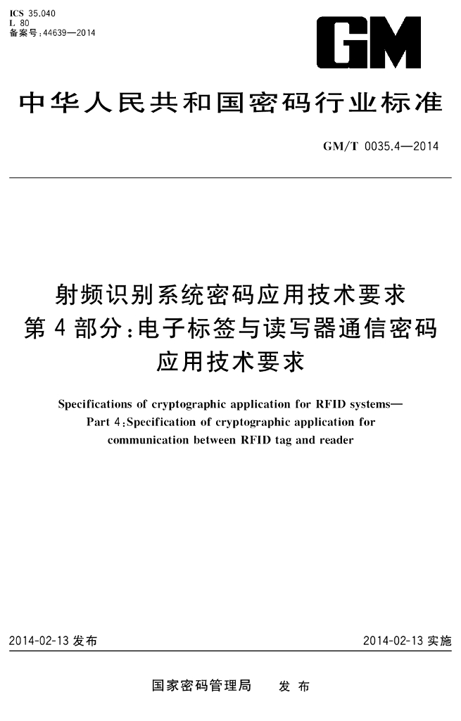 GM/T 0035.4-2014 射频识别系统密码应用技术要求 第4部分:电子标签与读写器通信密码应用技术要求
