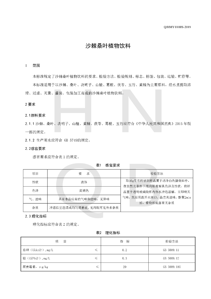 Q/HMY 0100S-2019 沙棘桑叶植物饮料