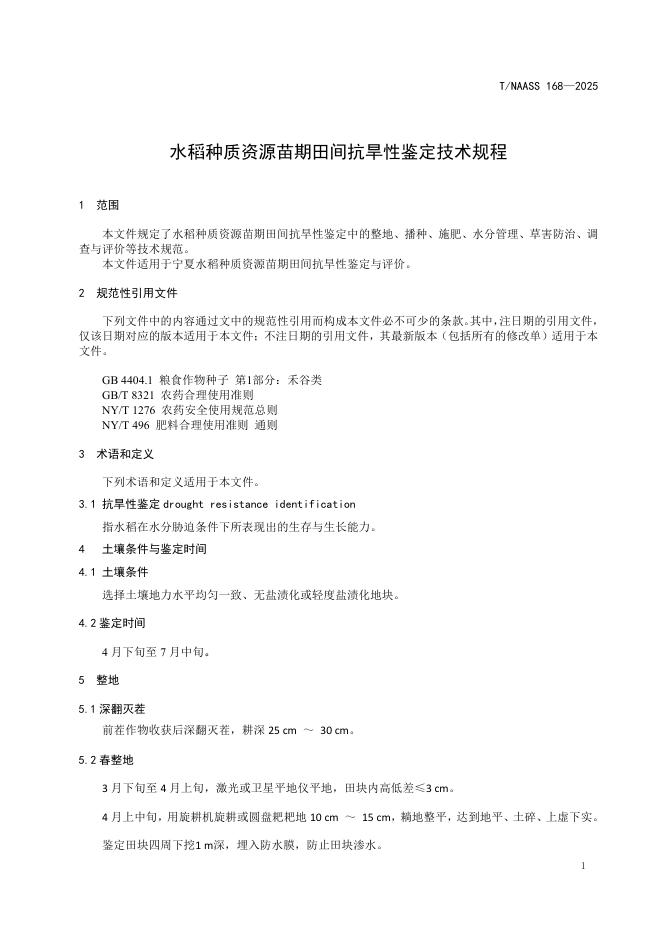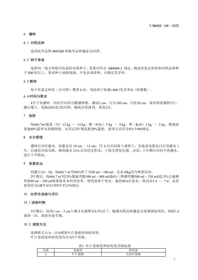 T/NAASS 168-2025 水稻种质资源苗期田间抗旱性鉴定技术 规程