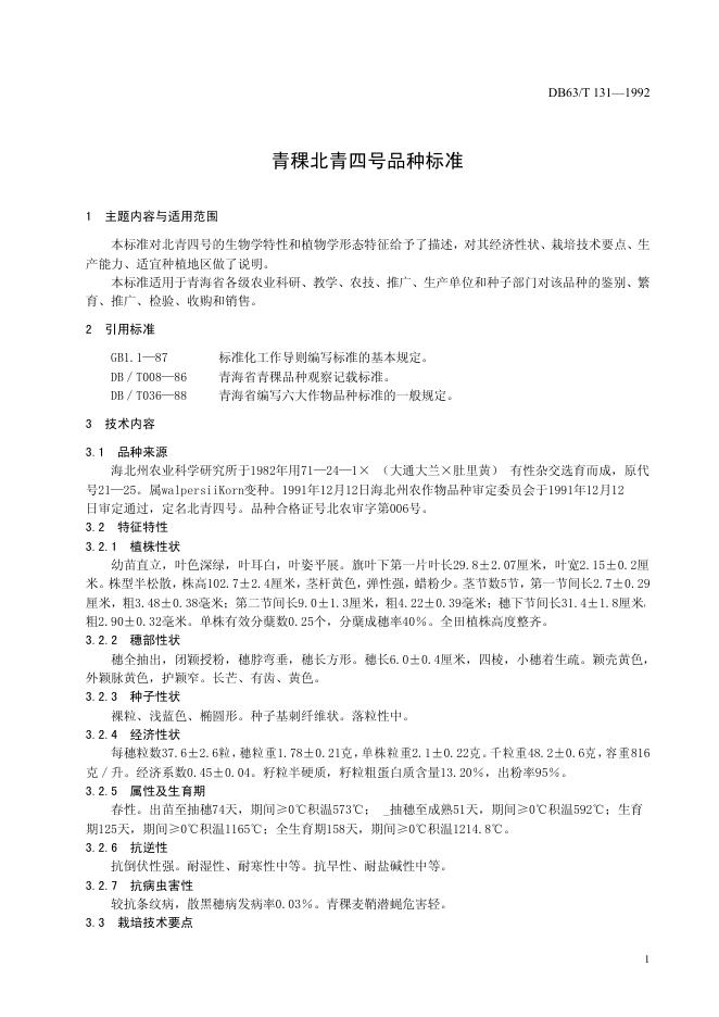 DB63/T 131-1992(2020) 青稞北青四号品种标准