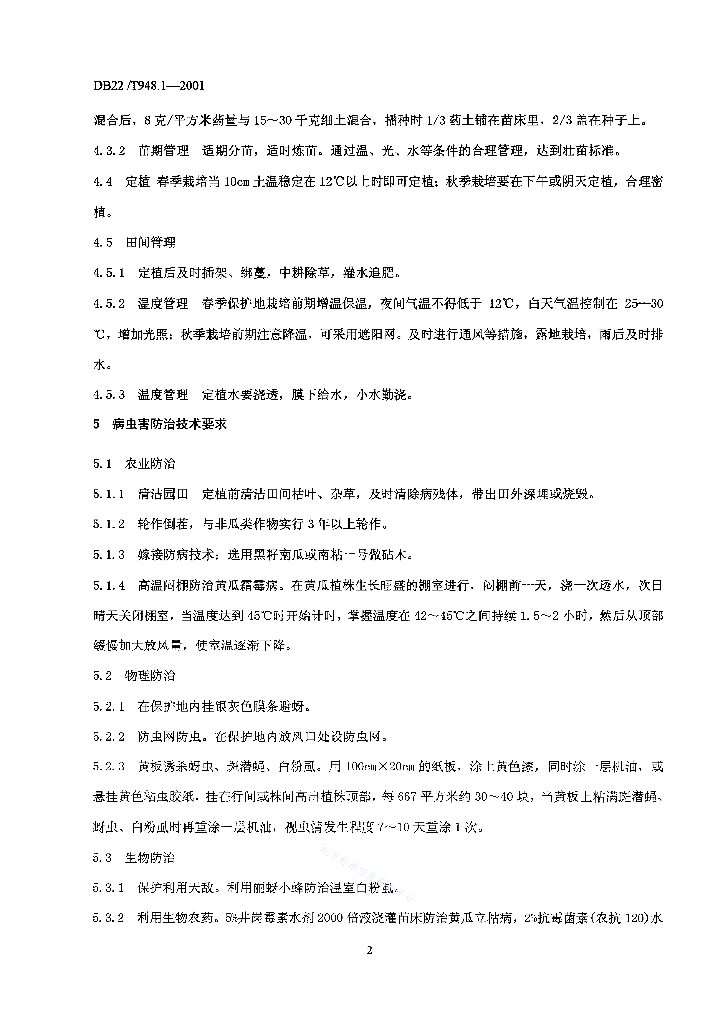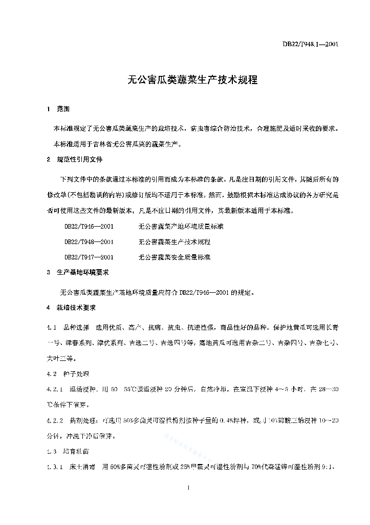 DB22/T 948.1-2001 无公害瓜类(黄瓜)蔬菜生产技术规程