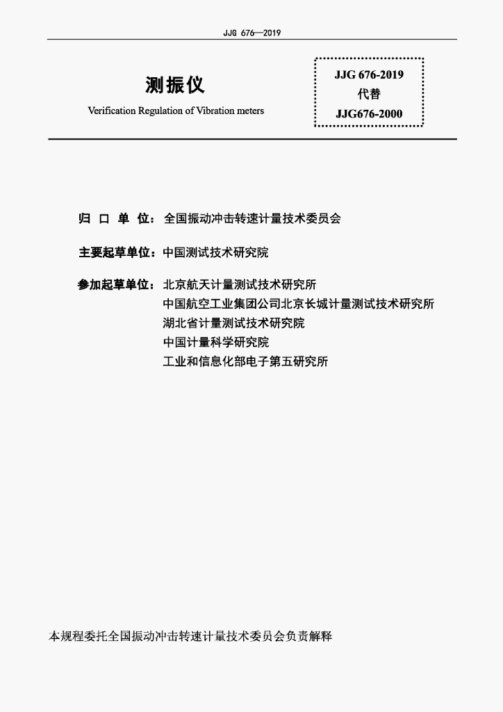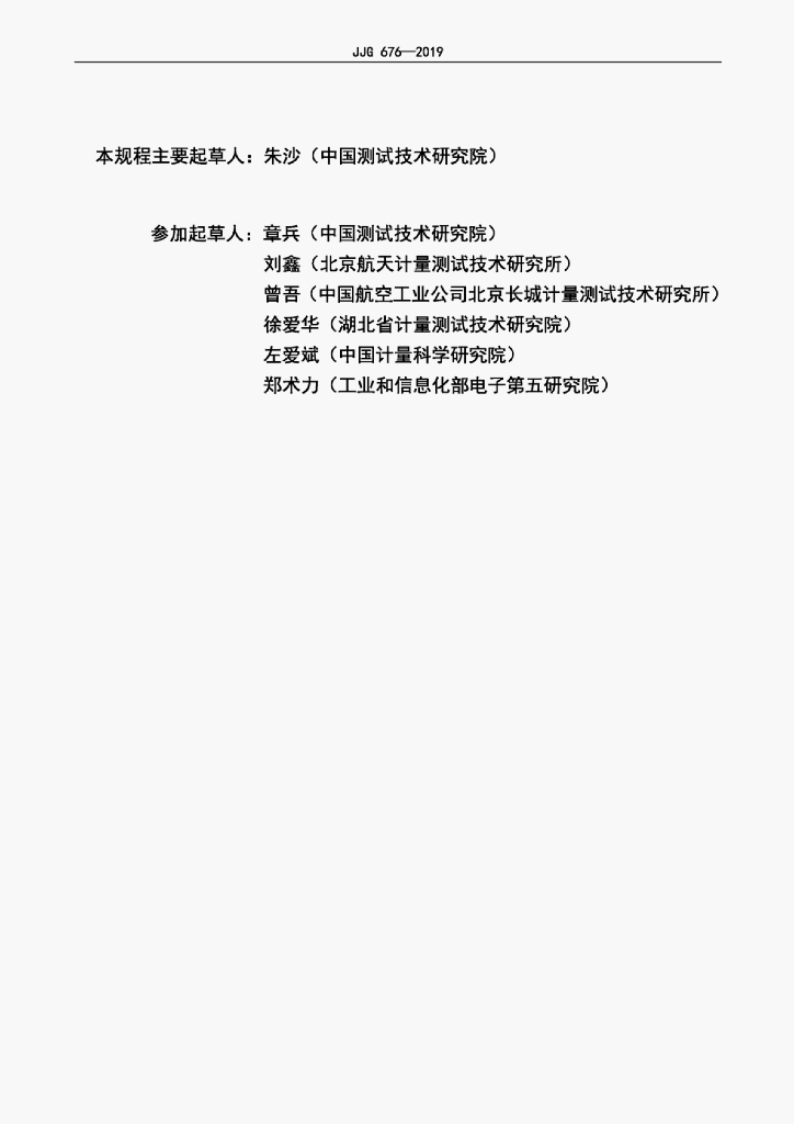 朱沙(中国测试技术研究院)、章兵(中国测试技术研究院)、刘鑫(北京航天计量测试技术研究所)、曾吾(中国航空工业集团公司北京长城计量测试技术研究所)、徐爱华(湖北省计量测试技术研究院)、左爱斌(中国计量科学研究院)、郑术力(工业和信息化部电子第五研究院)