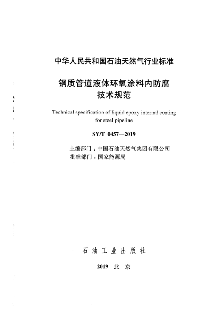 SY/T 0457-2019 钢质管道液体环氧涂料内防腐技术规范