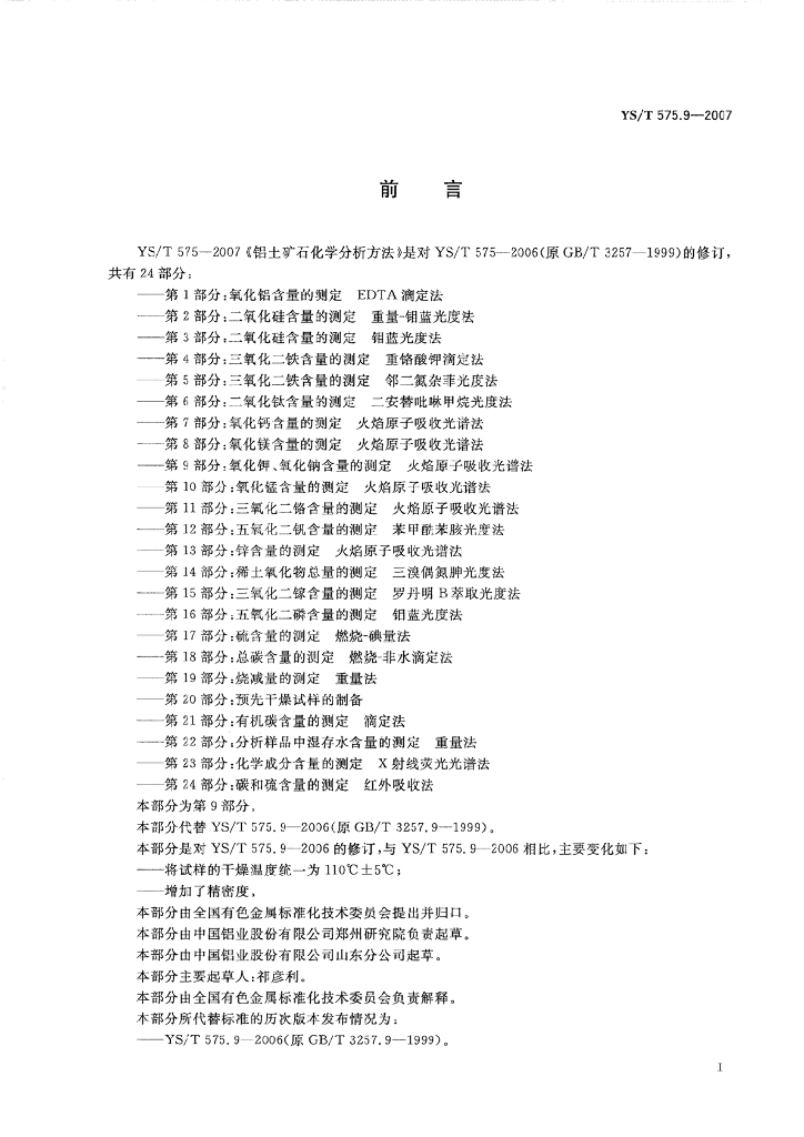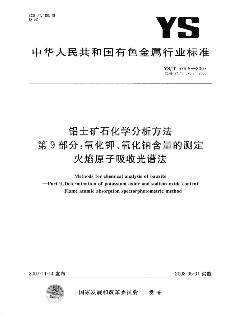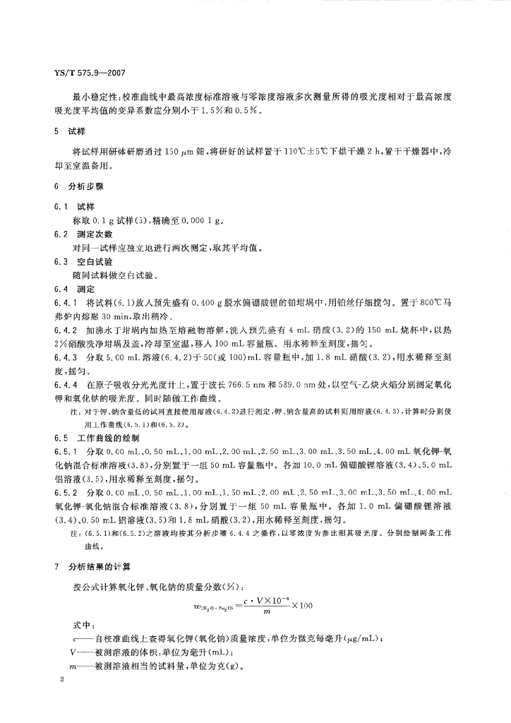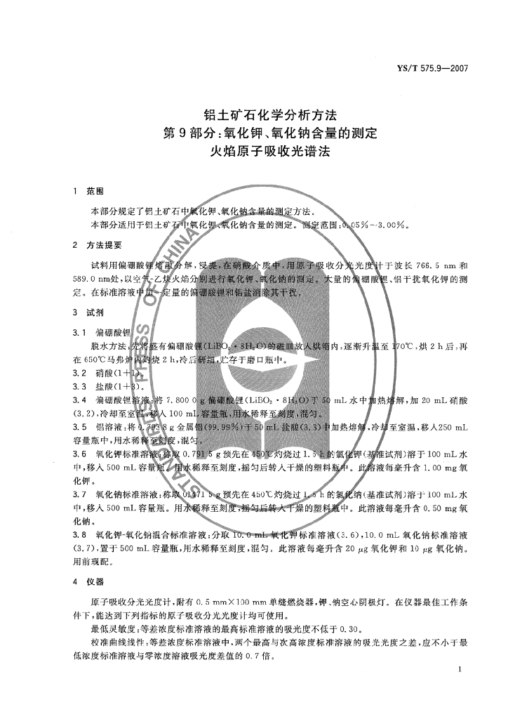 YS/T 575.9-2007 铝土矿石化学分析方法 第9部分:氧化钾、氧化钠含量的测定 火焰原子吸收光谱法