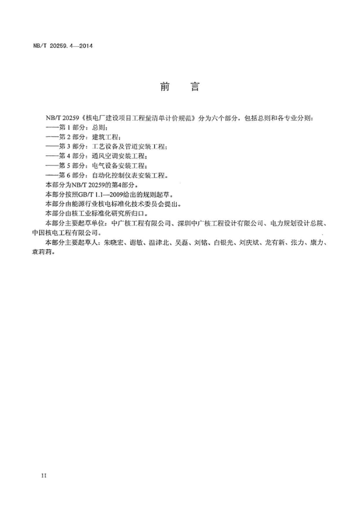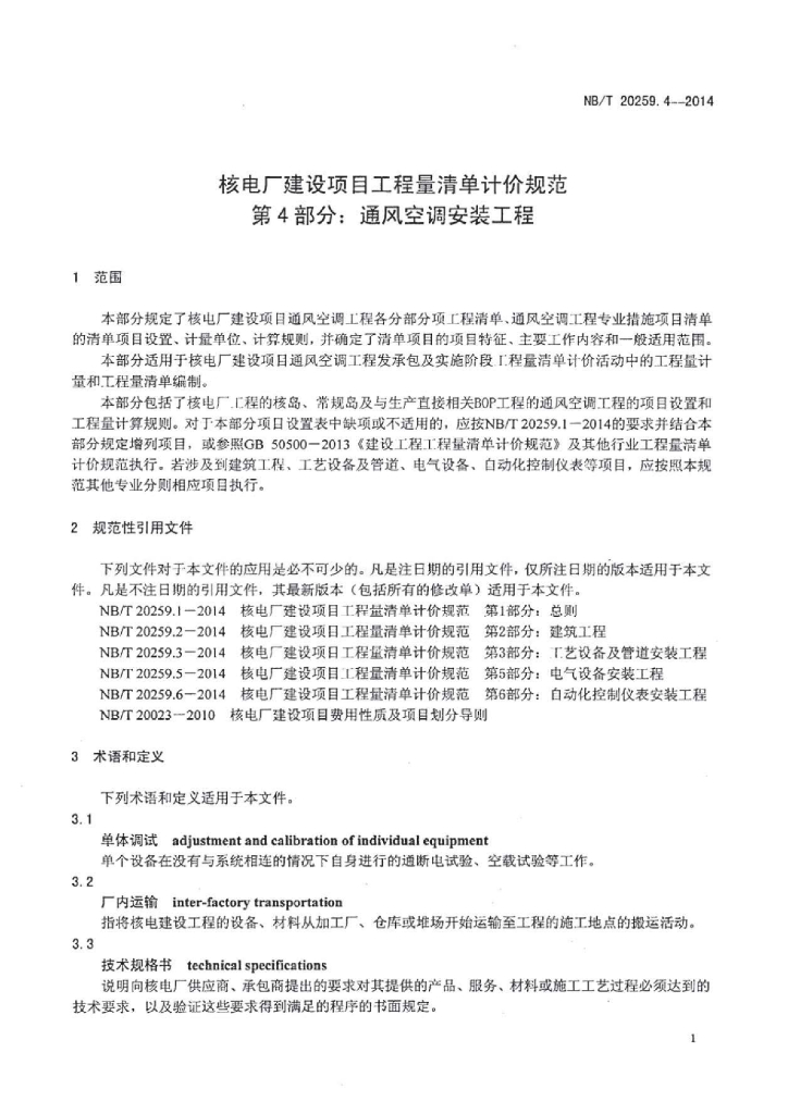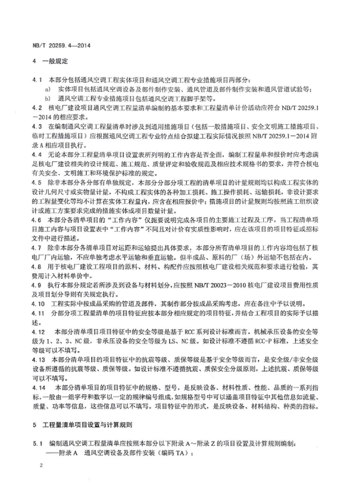 NB/T 20259.4-2014 核电厂建设项目工程量清单计价规范 第4部分:通风空调安装工程