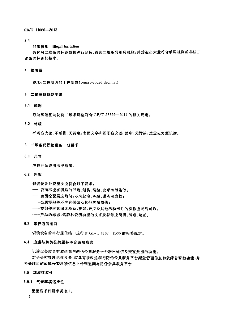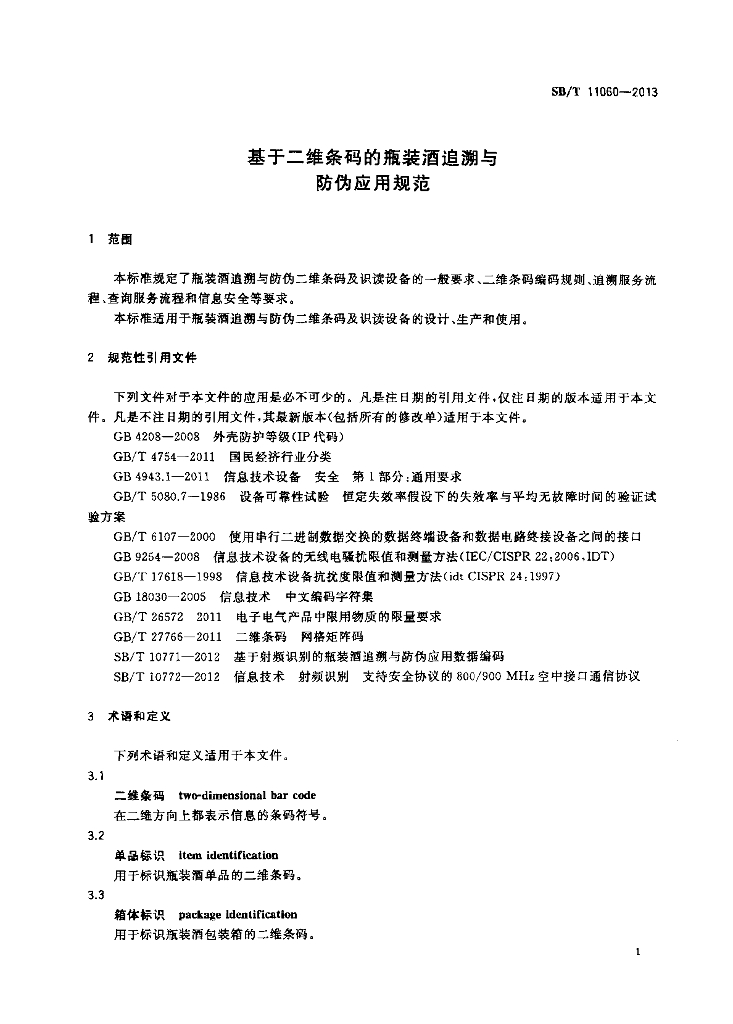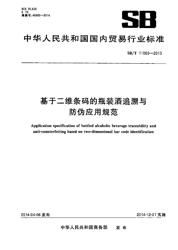 SB/T 11060-2013 基于二维条码的瓶装酒追溯与防伪应用规范
