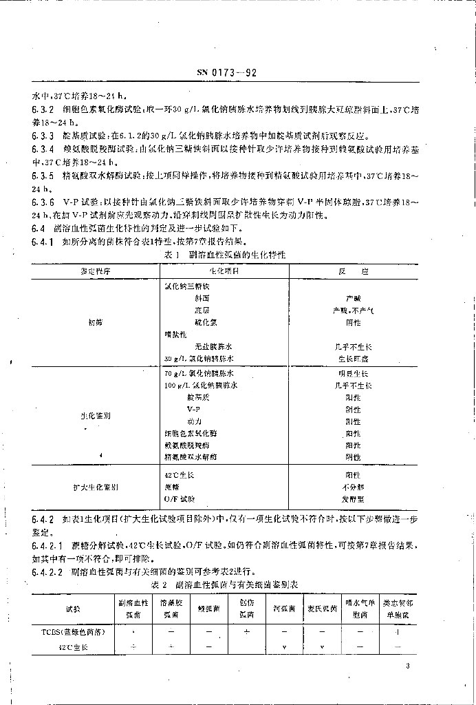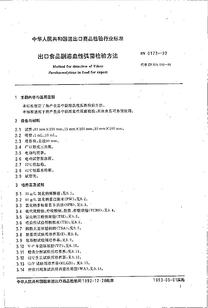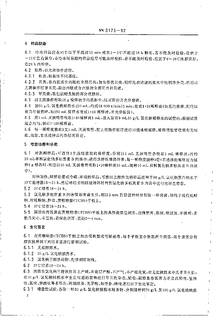 SN 0173-1992 出口食品副溶血性弧菌检验方法