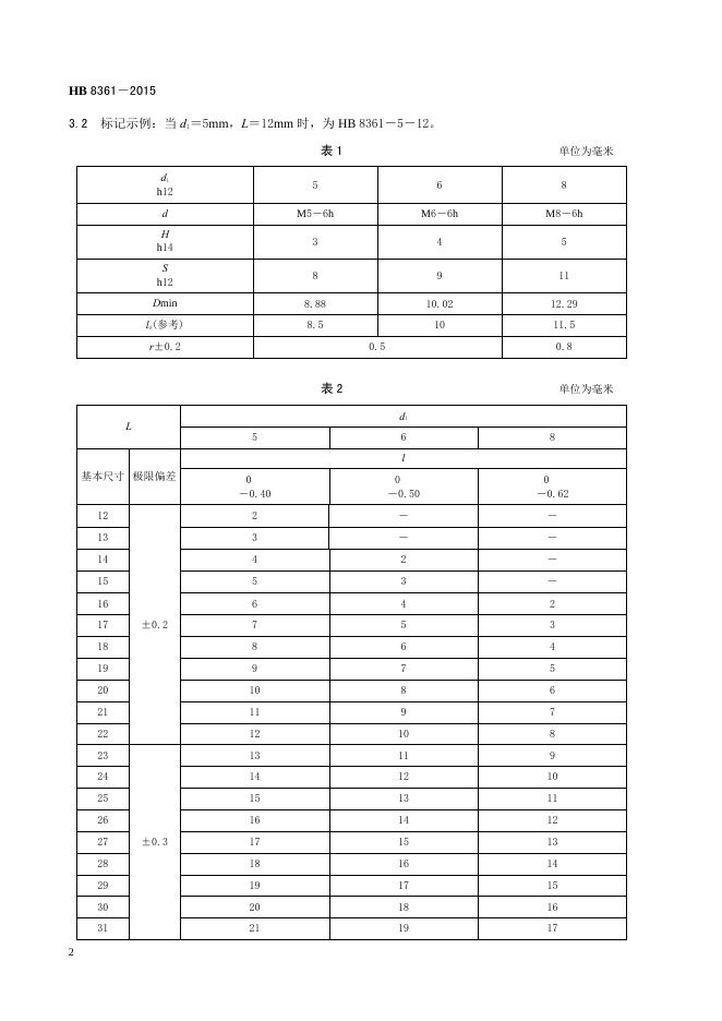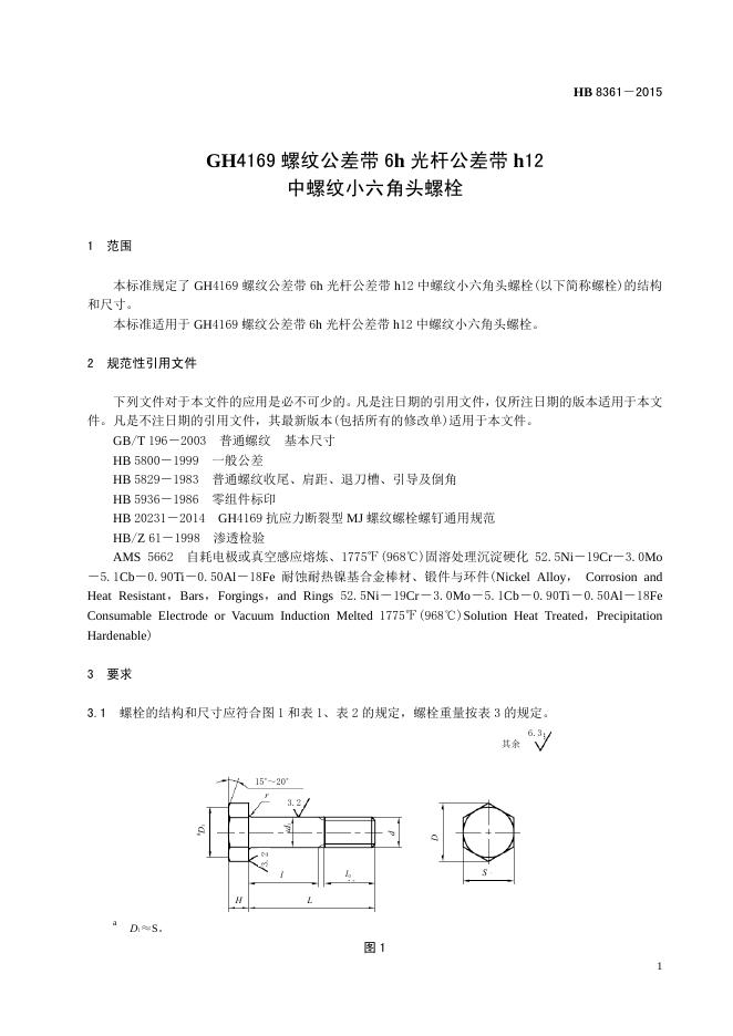 HB 8361-2015 GH4169螺纹公差带6H光杆公差带H12中螺纹小六角头螺栓(2017)
