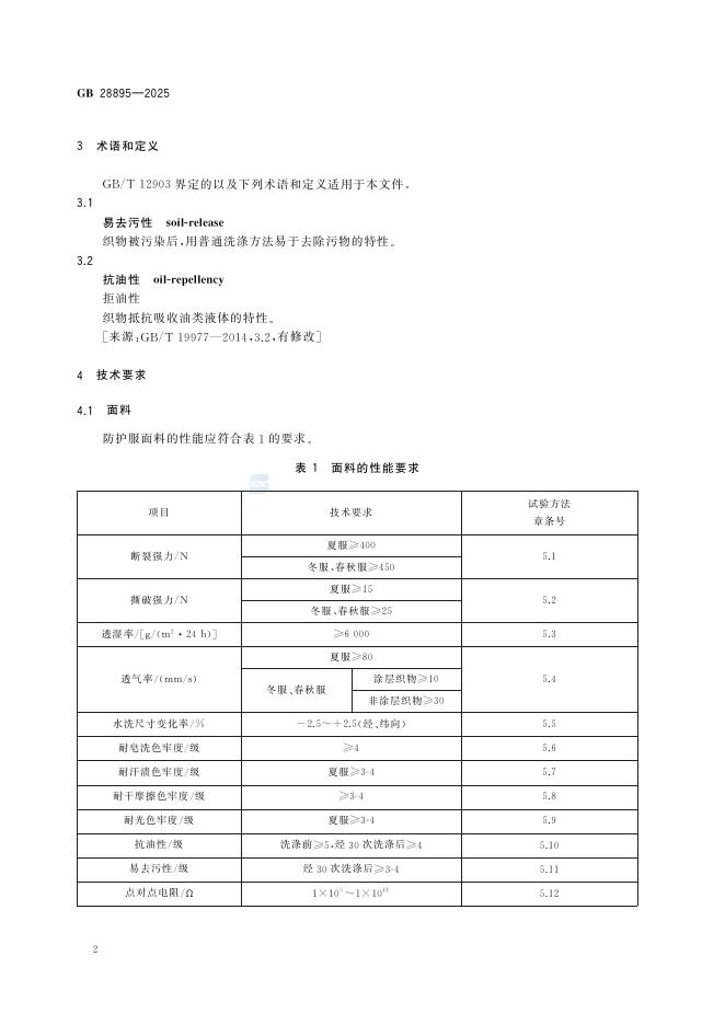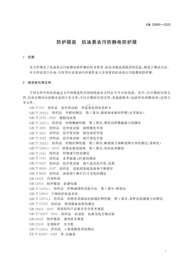 GB 28895-2025 防护服装 抗油易去污防静电防护服