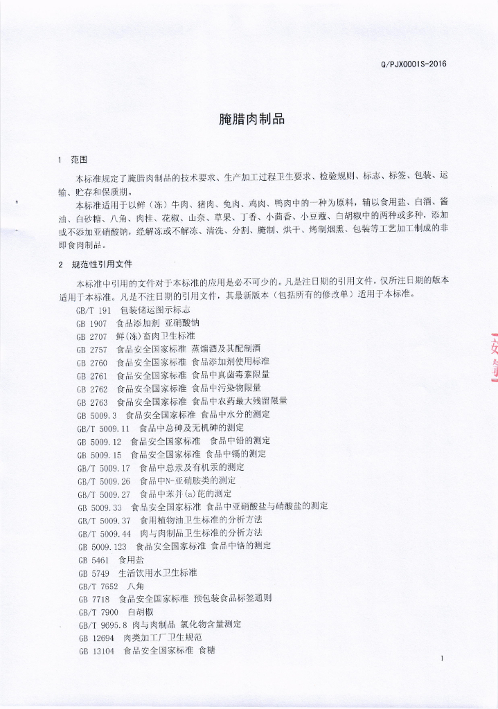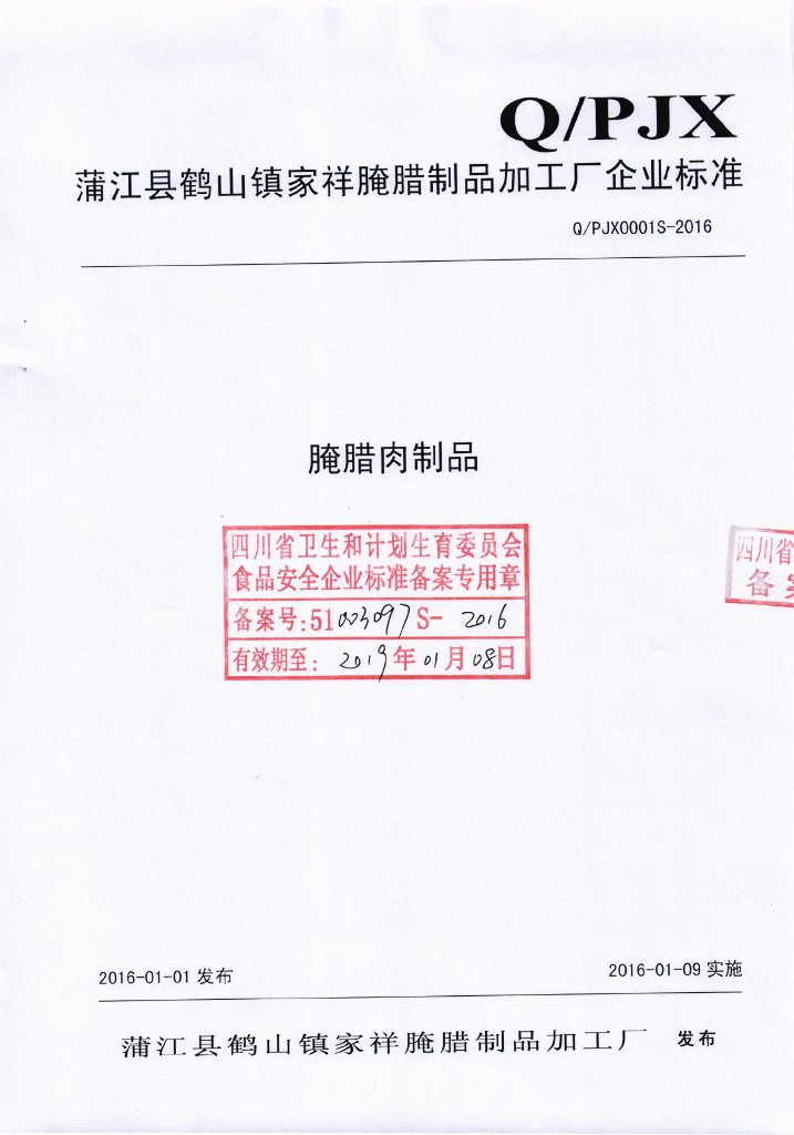 Q/PJX 0001S-2016 蒲江县鹤山镇家祥腌腊制品加工厂 腌腊肉制品