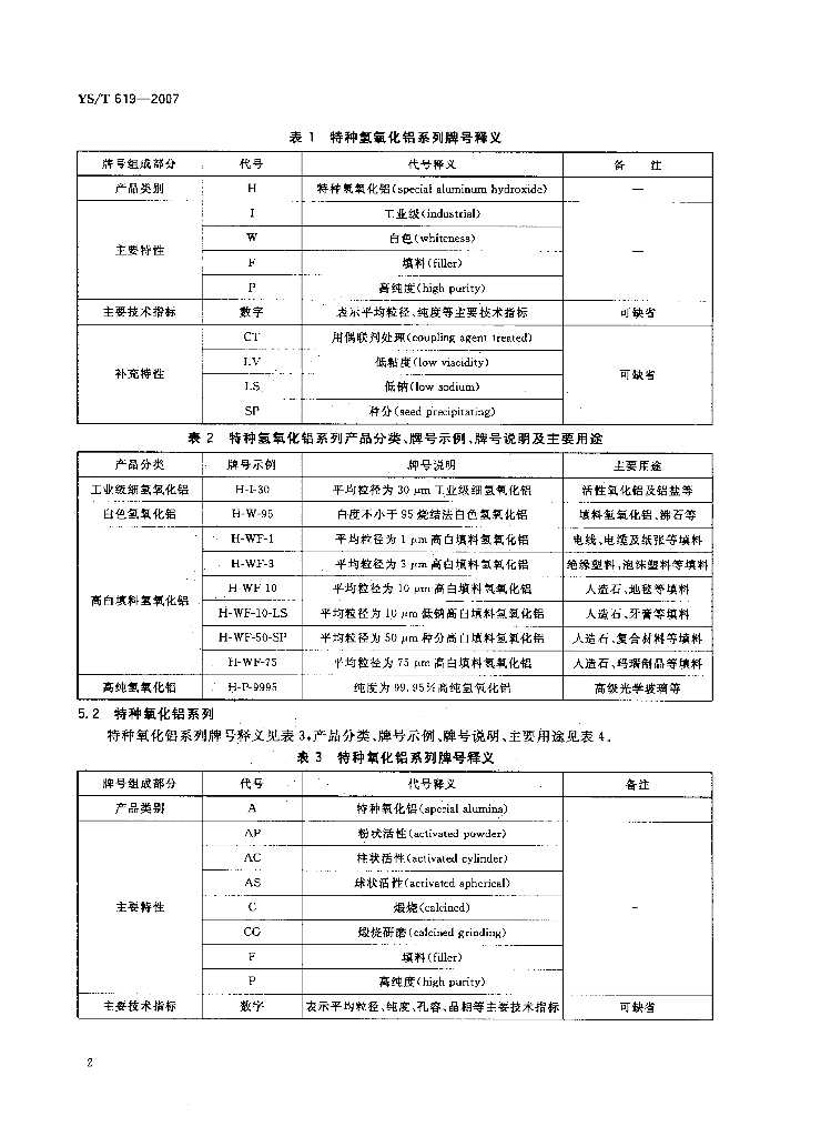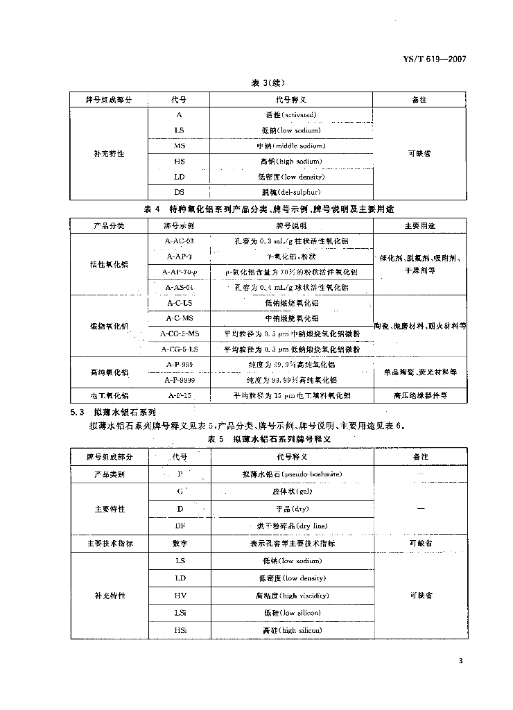 YS/T 619-2007 化学品氧化铝分类及牌号命名