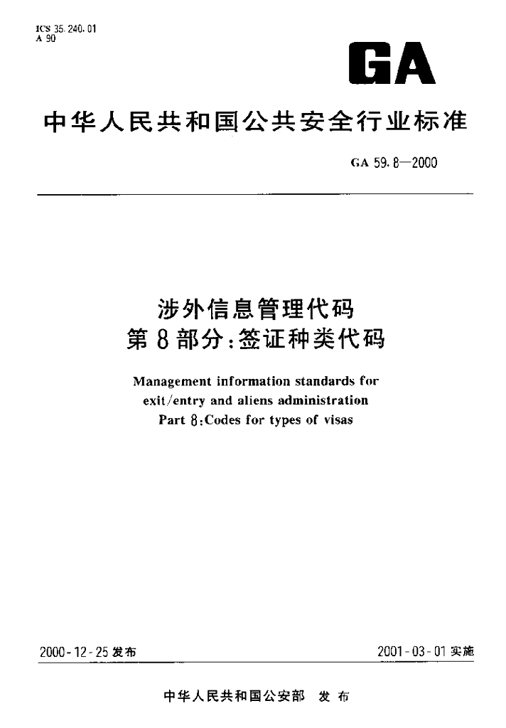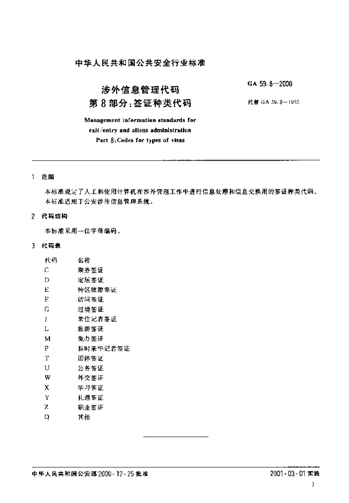 GA 59.8-2000 涉外信息管理代码 第8部分:签证种类代码