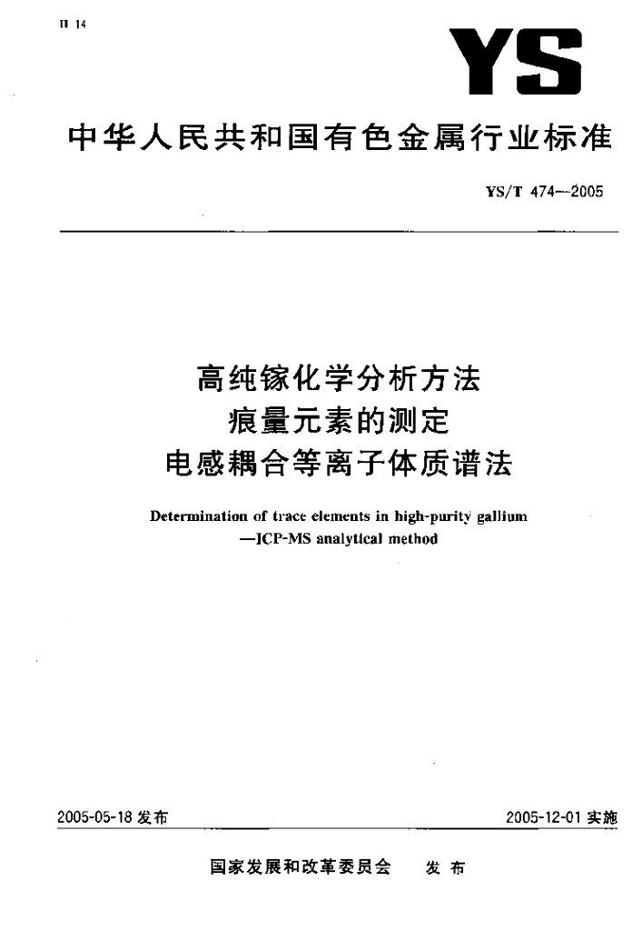 YS/T 474-2005 高纯镓化学分析方法痕量元素的测定电感耦合等离子体质谱法
