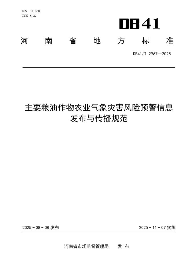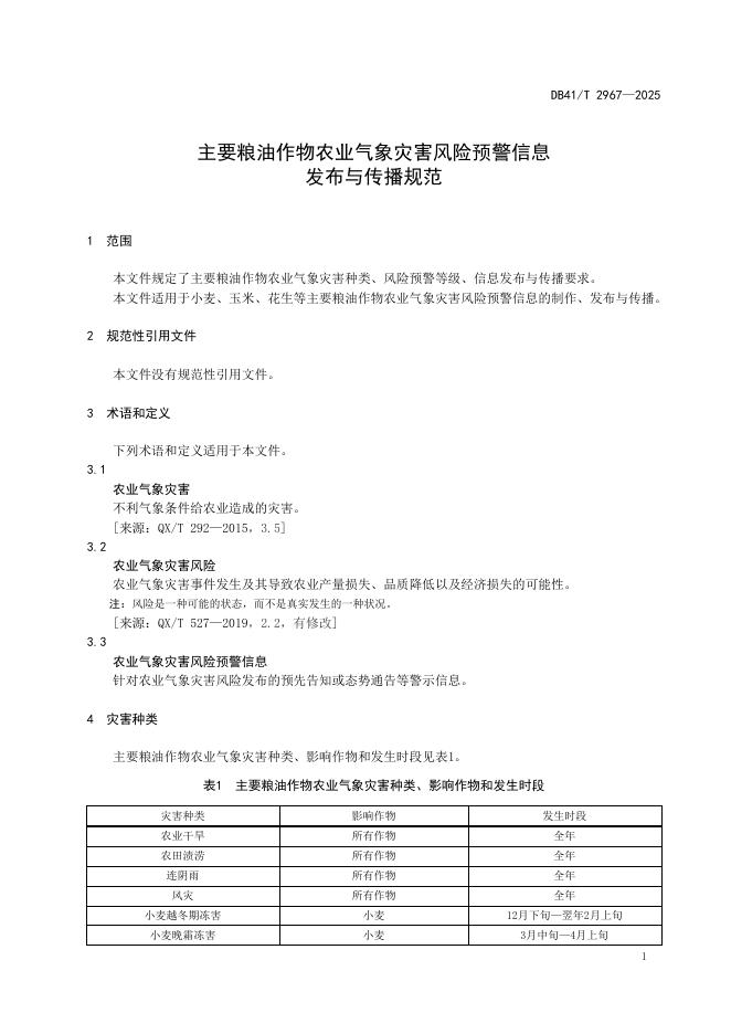 DB41/T 2967-2025 主要粮油作物农业气象灾害风险预警信息发布与传播规范