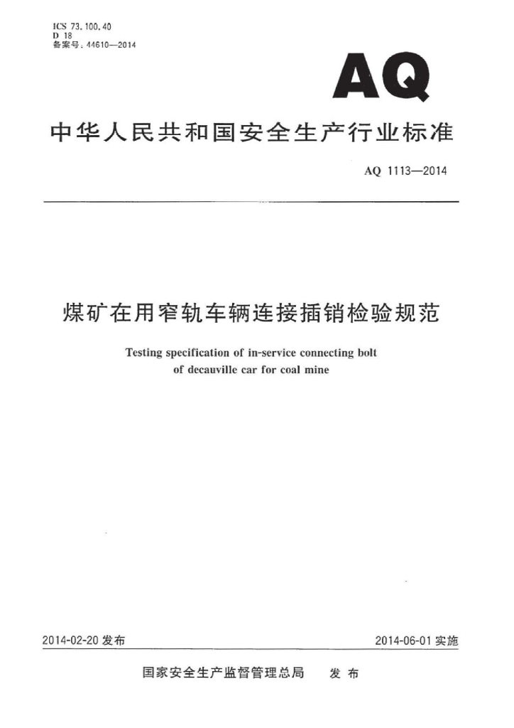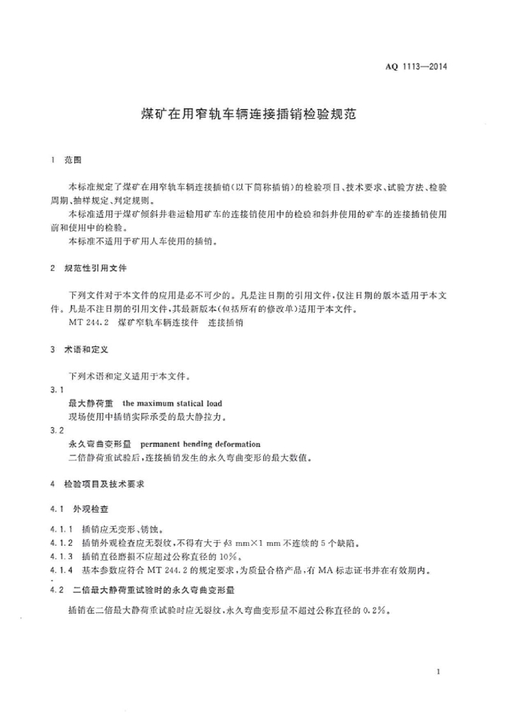 AQ 1113-2014 煤矿在用窄轨车辆连接插销检验规范