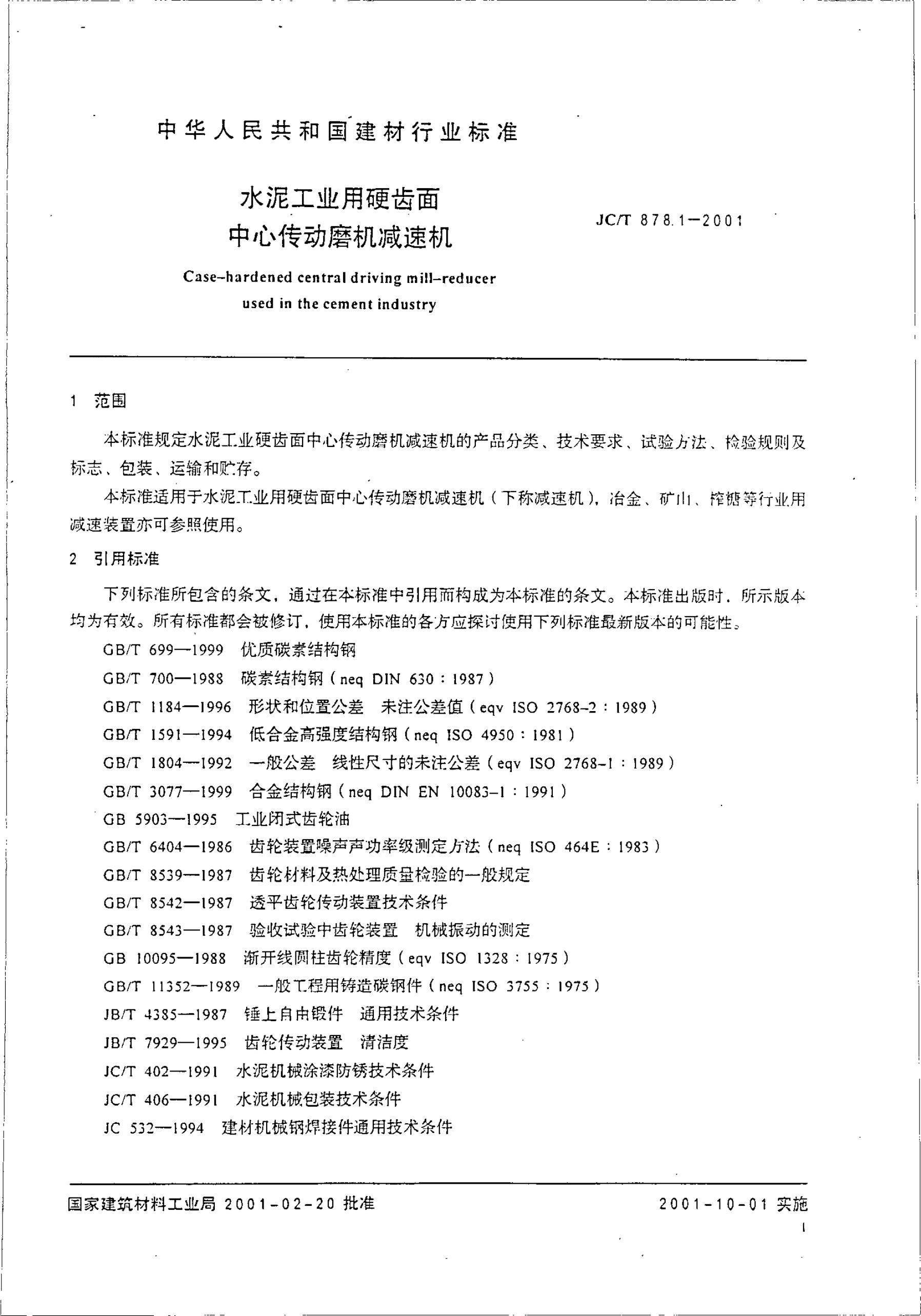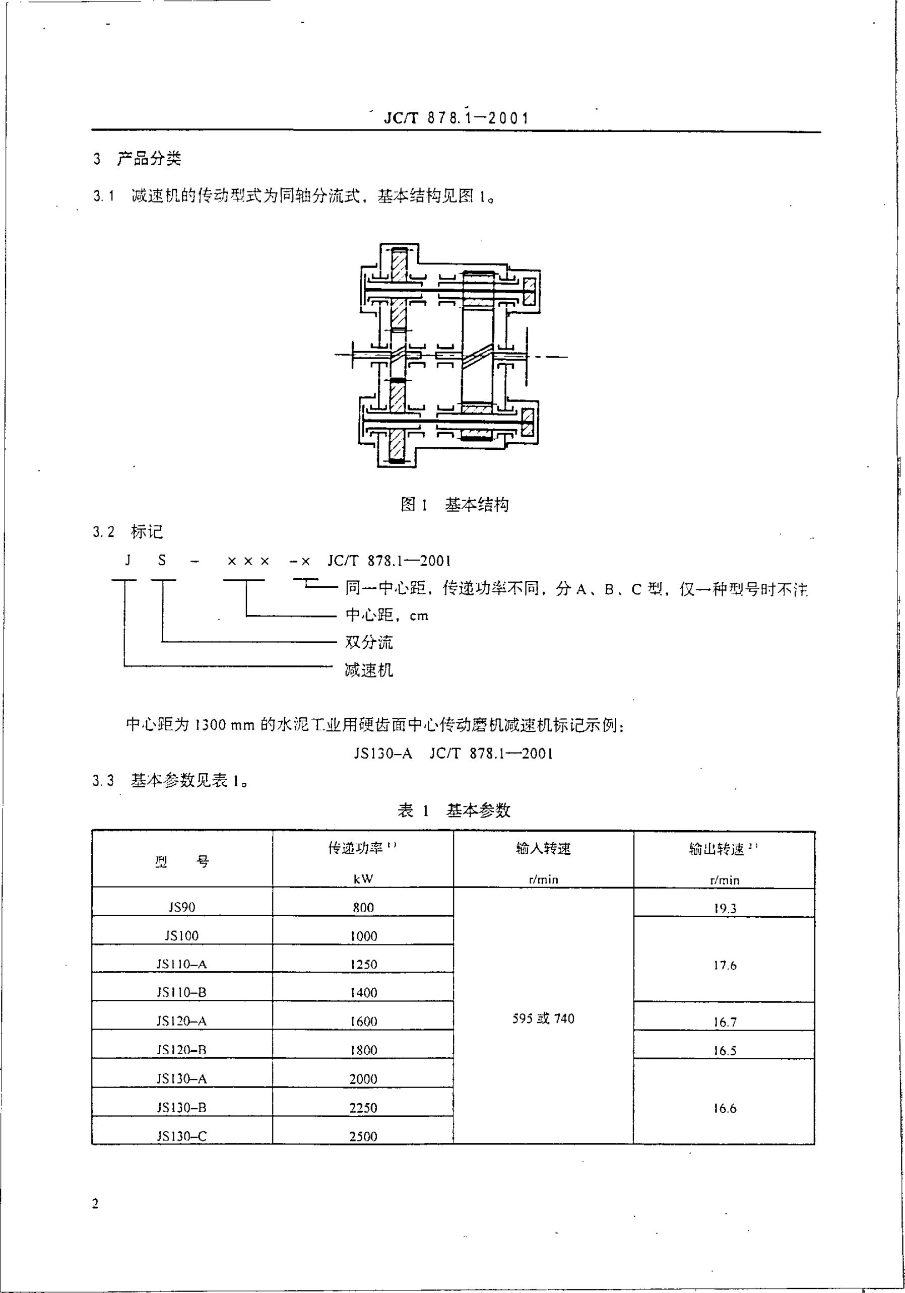 JC/T 878.1-2001 水泥工业用硬齿面中心传动磨机减速机