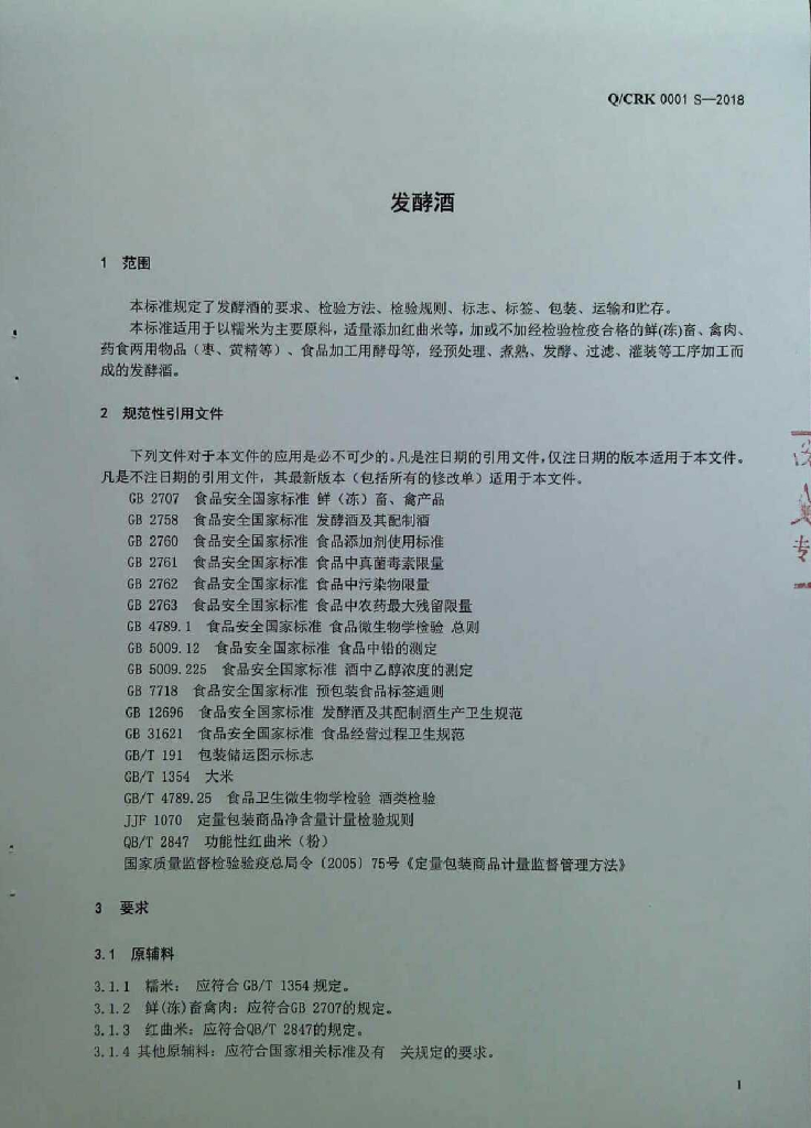 Q/CRK 0001S-2018 发酵酒