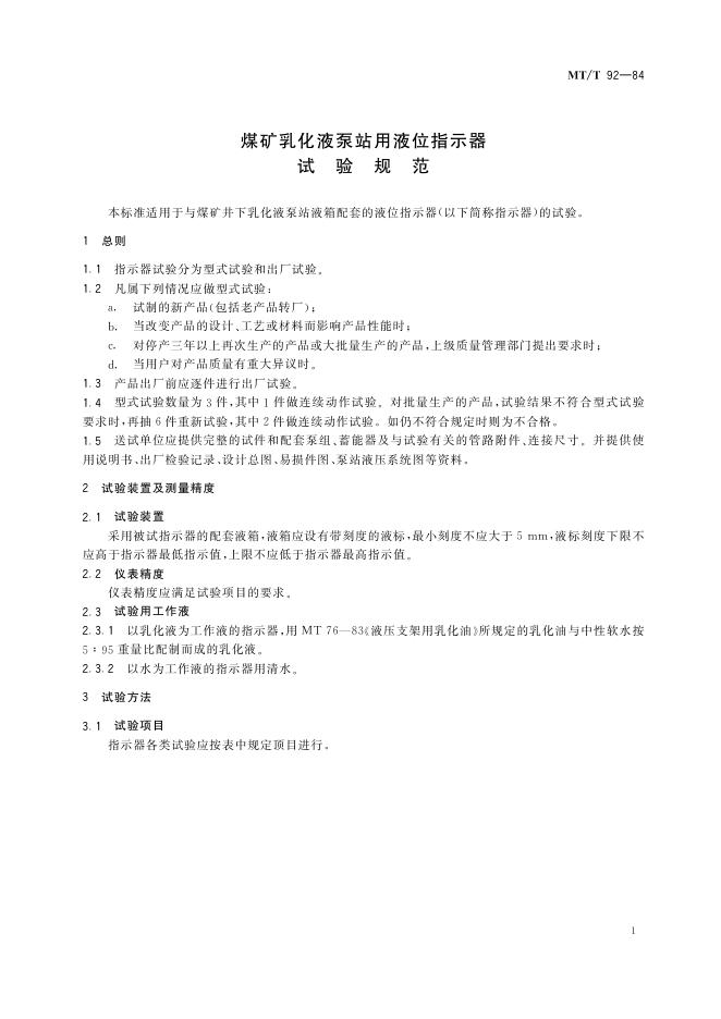 MT/T 92-1984 煤矿乳化液泵站用液位指示器试验规范