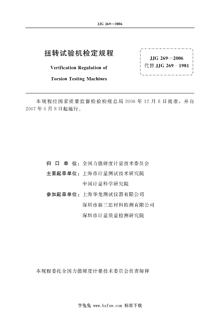 张贵仁(上海市计量测试技术研究院)、沃兆廷(上海市计量测试技术研究院)、张智敏(中国计量科学研究院)、印保靖(上海市计量测试技术研究院)、成勇(上海市计量测试技术研究院)、姚文倬(上海华龙测试仪器有限公司)、赵湘江(深圳市新三思材料检测有限公司)、安建平(深圳市新三思材料检测有限公司)、虞跃凌(上海市计量测试技术研究院)、陈云庆(上海市计量测试技术研究院)、黄仕源(深圳市计量质量检测研究院)