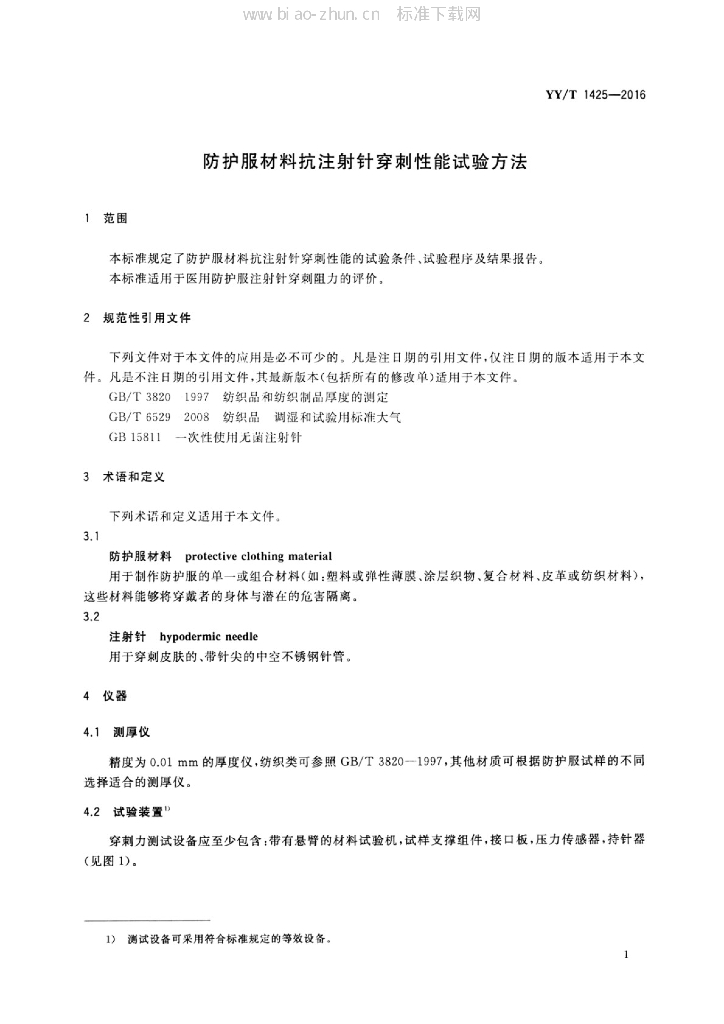 YY/T 1425-2016 防护服材料抗注射针穿刺性能试验方法
