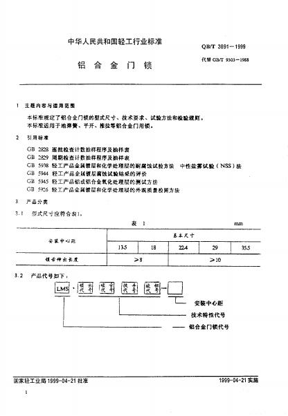 QB/T 3891-1999 铝合金门锁