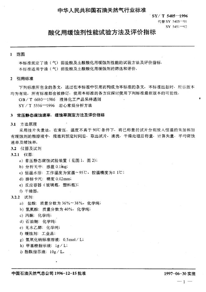 SY 5405-1992 盐酸酸化缓蚀剂性能的试验方法及评价指标