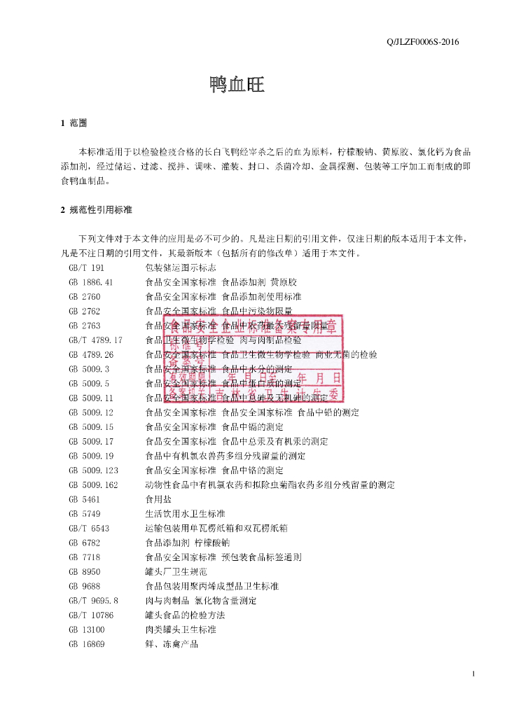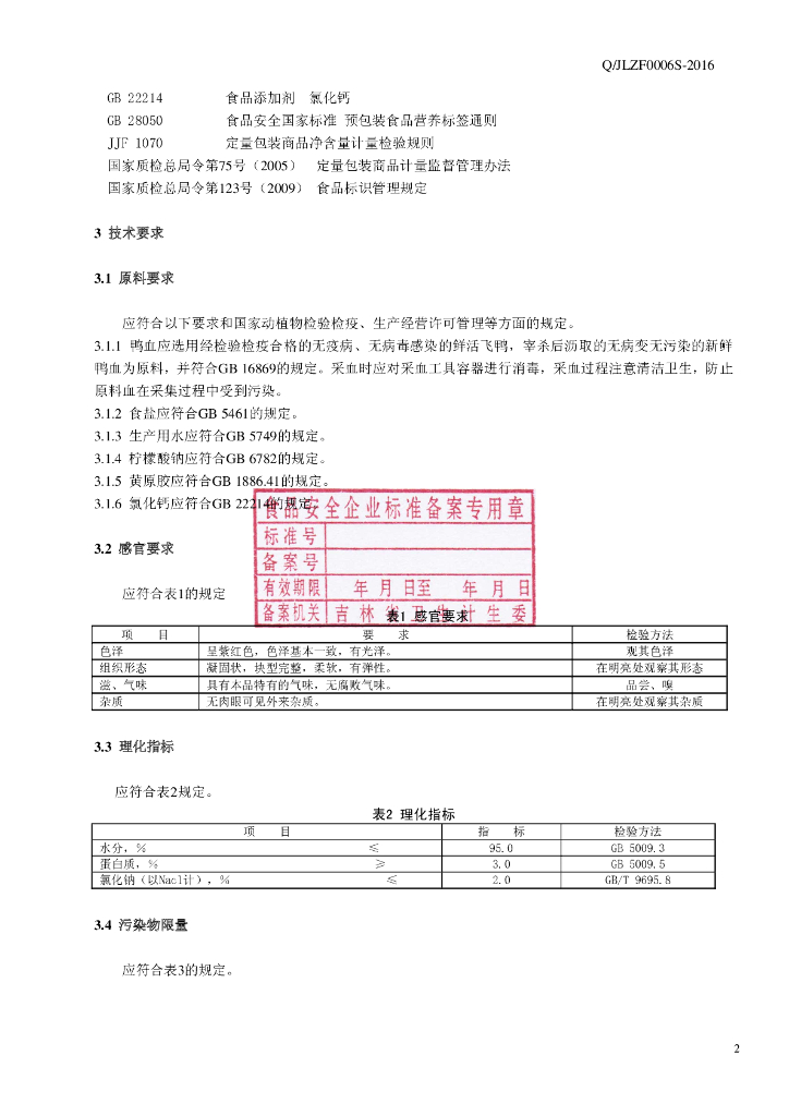 Q/JLZF 0006S-2016 吉林正方农牧股份有限公司 鸭血旺