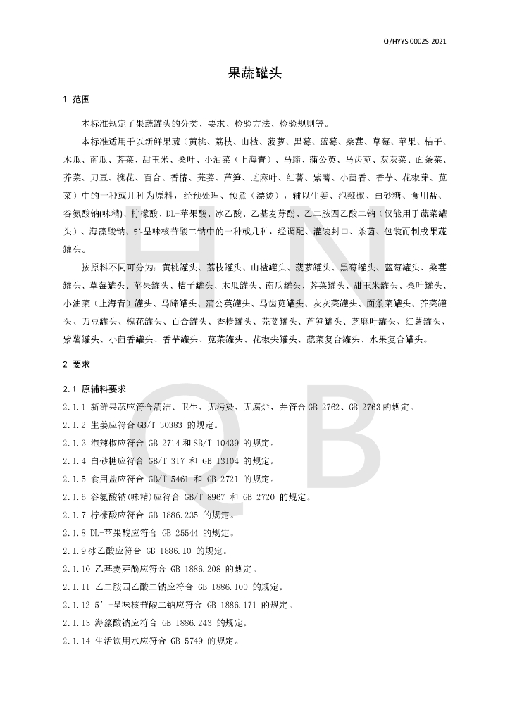 Q/HYYS 0002S-2021 果蔬罐头