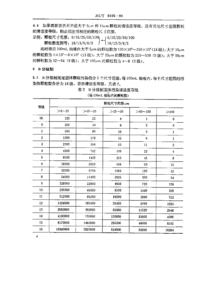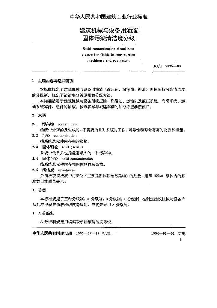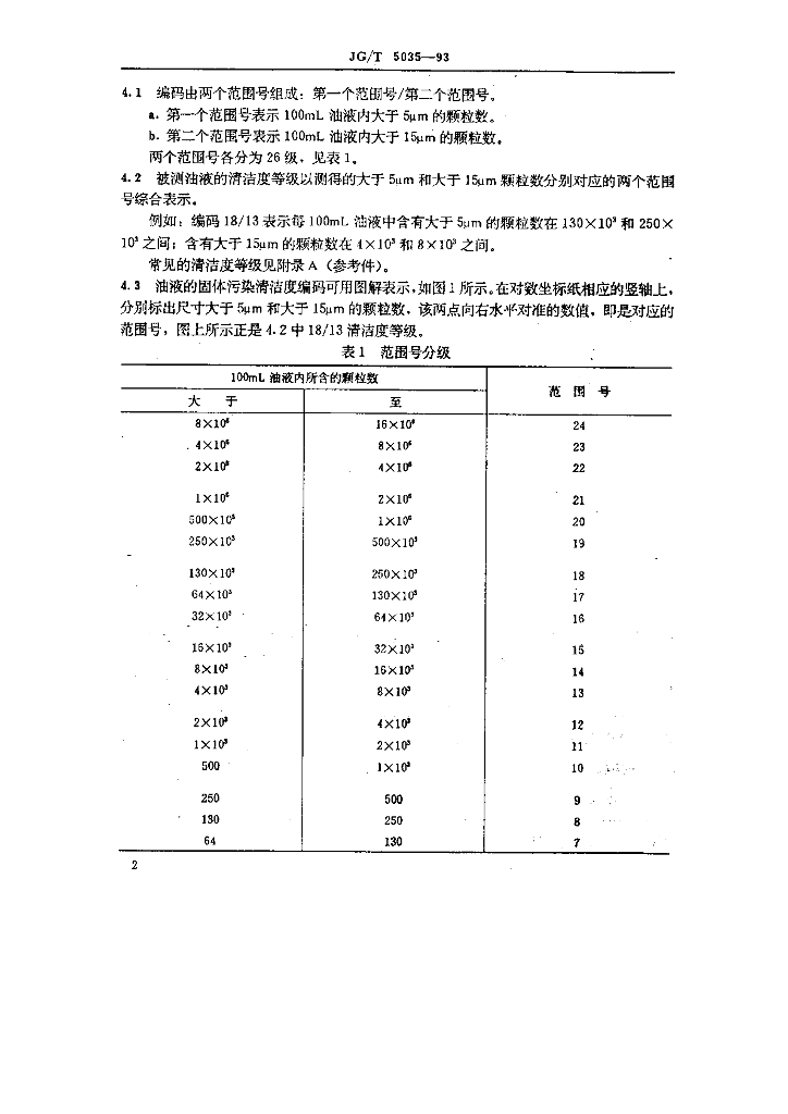 JG/T 5035-1993 建筑机械与设备用油液固体污染清洁度分级