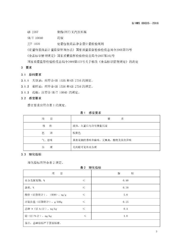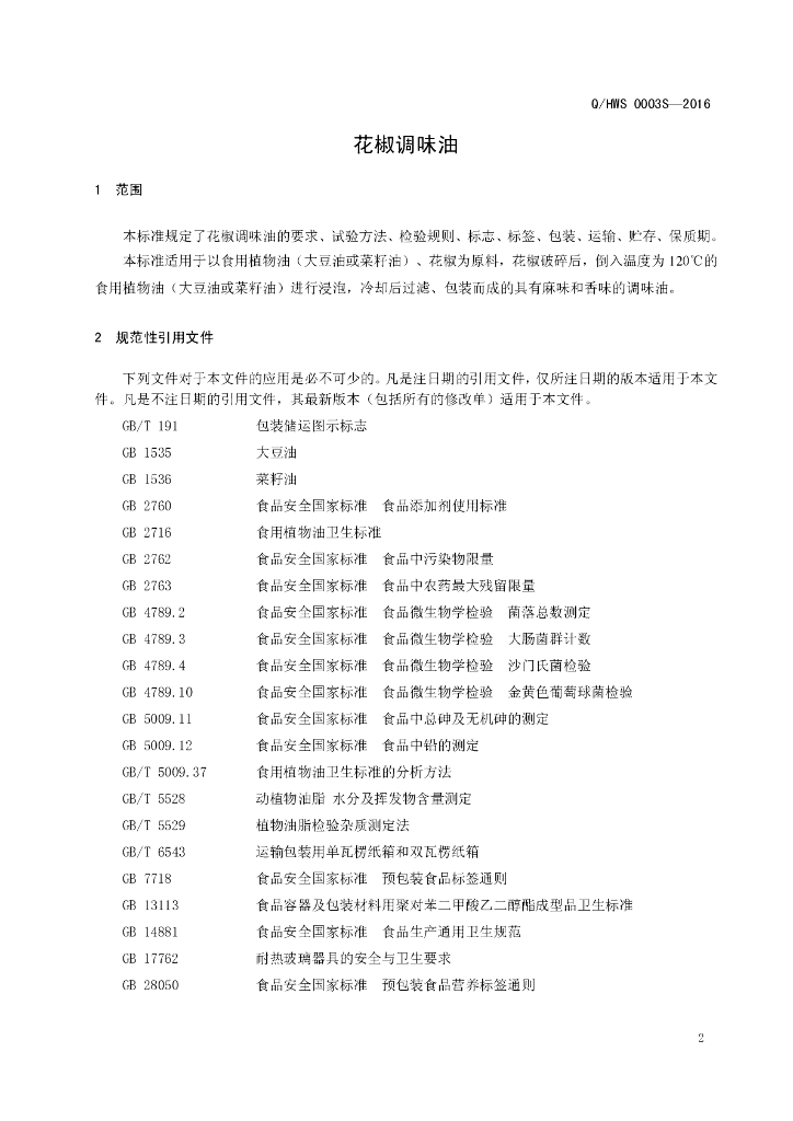 Q/HWS 0003S-2016 河南王胖子食品有限公司 花椒调味油
