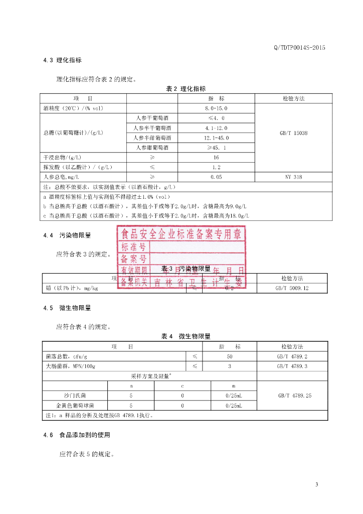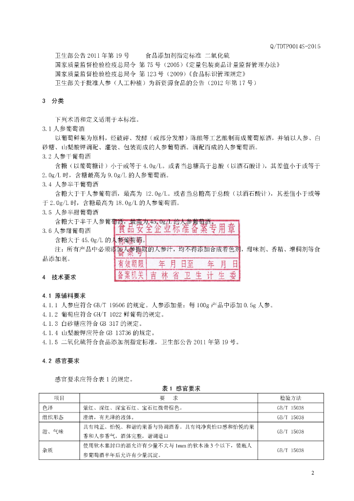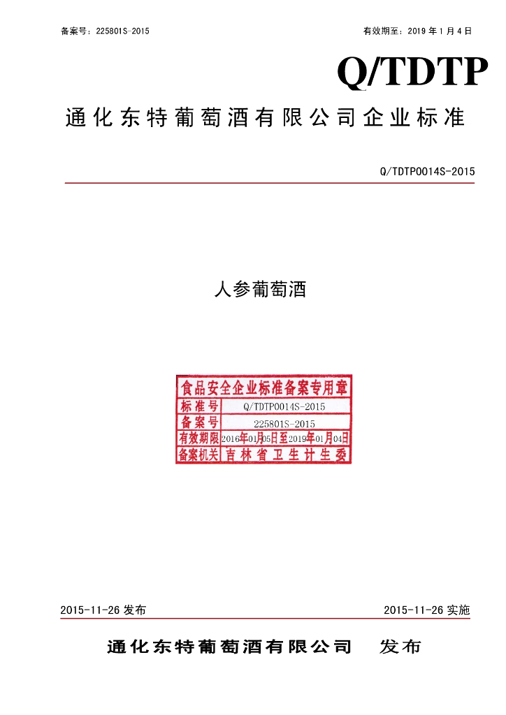 Q/TDTP 0014S-2015 通化东特葡萄酒有限公司 人参葡萄酒
