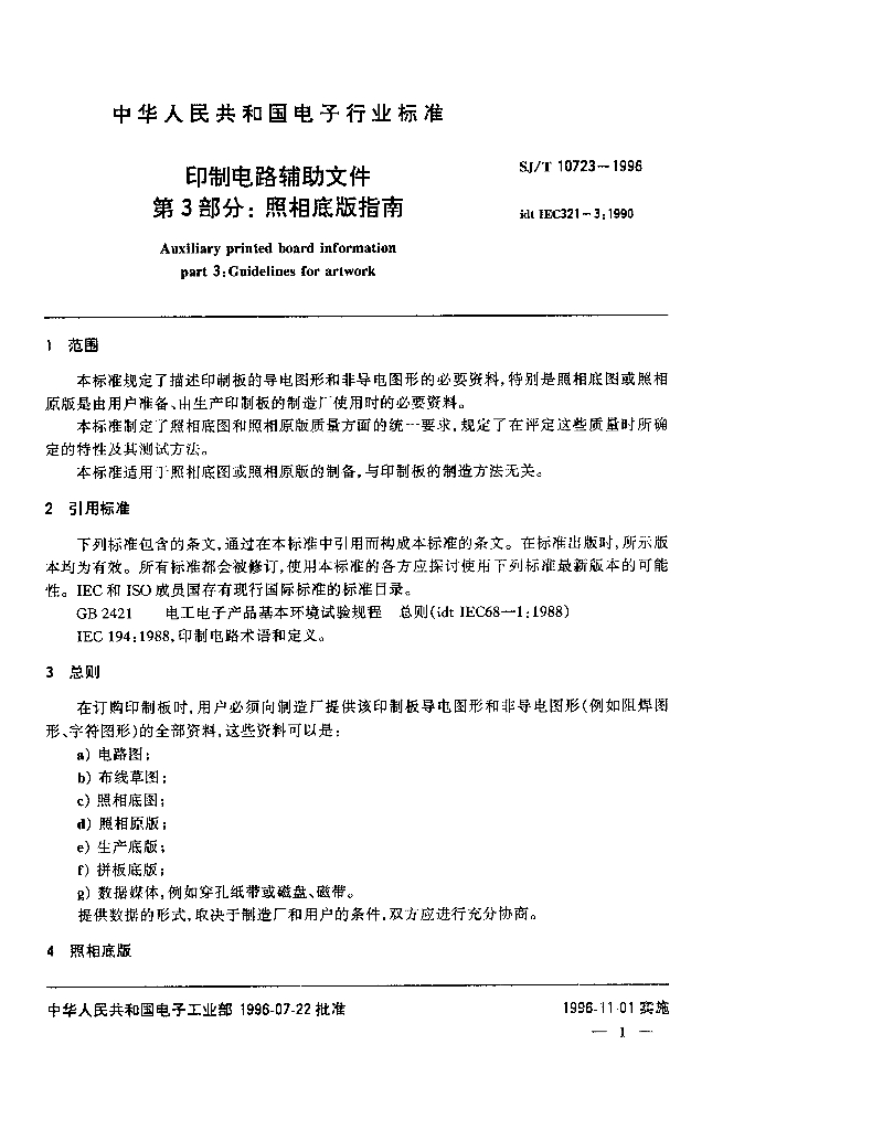 SJ/T 10723-1996 印制电路辅助文件 第3部分 照相底板指南