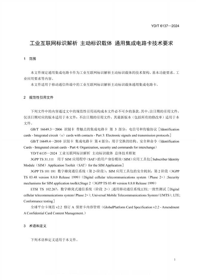 YD/T 6137-2024 工业互联网标识解析 主动标识载体 通用集成电路卡技术要求