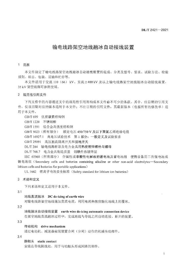 DL/T 2421-2021 输电线路架空地线融冰自动接线装置