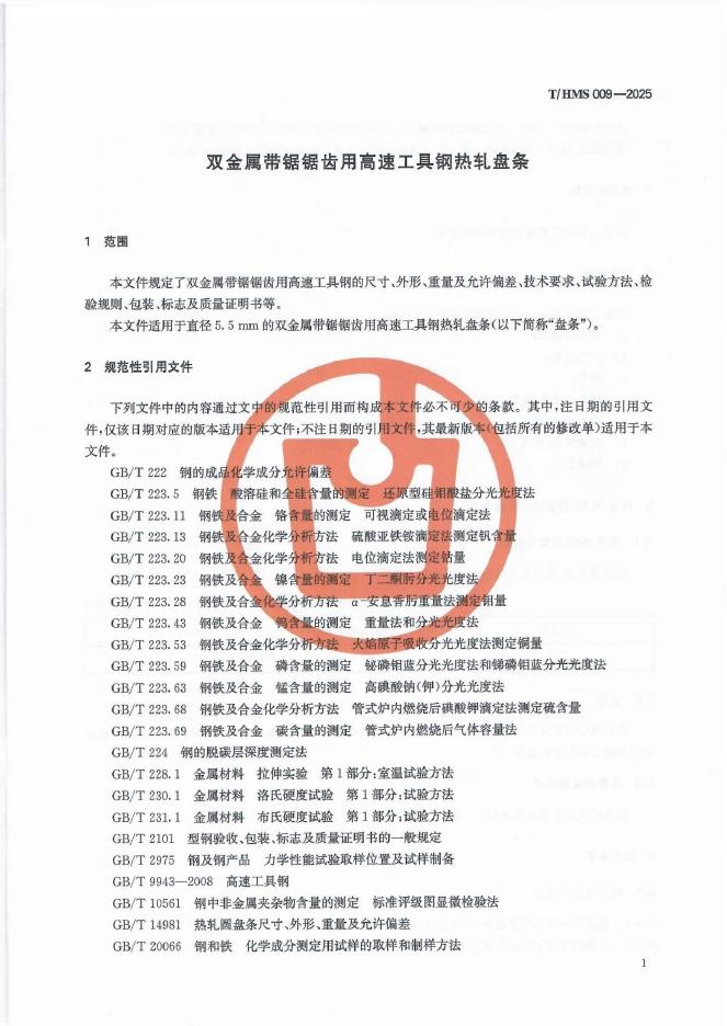 T/HMS 009-2025 双金属带锯锯齿用高速工具钢热轧盘条
