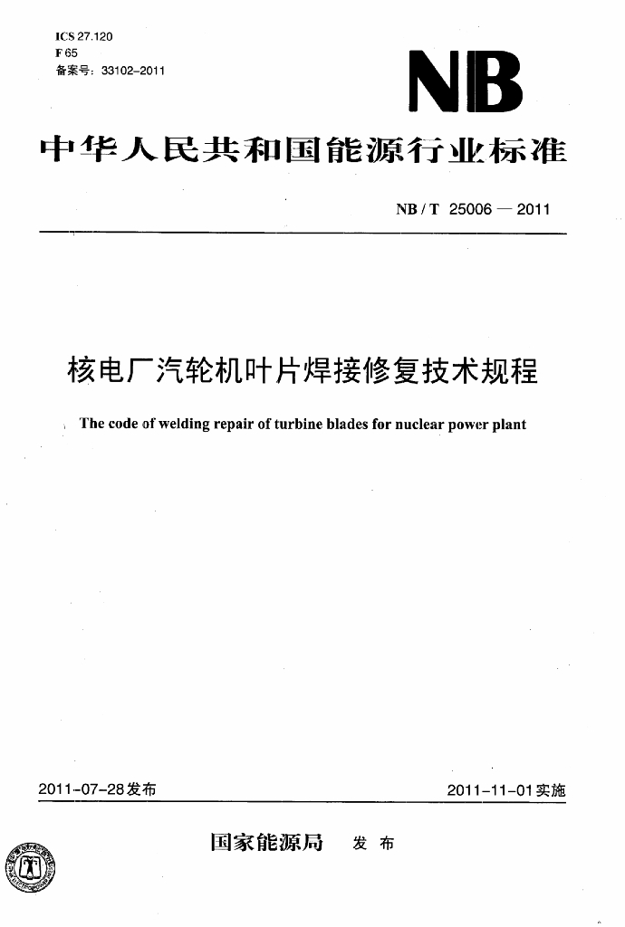 NB/T 25006-2011 核电厂汽轮机叶片焊接修复技术规程