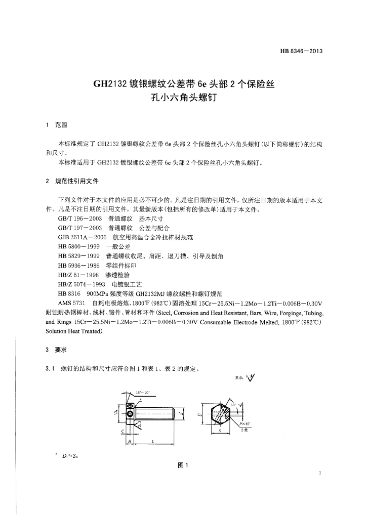HB 8346-2013 GH2132镀银螺纹公差带6e头部2个保险丝孔小六角头螺钉