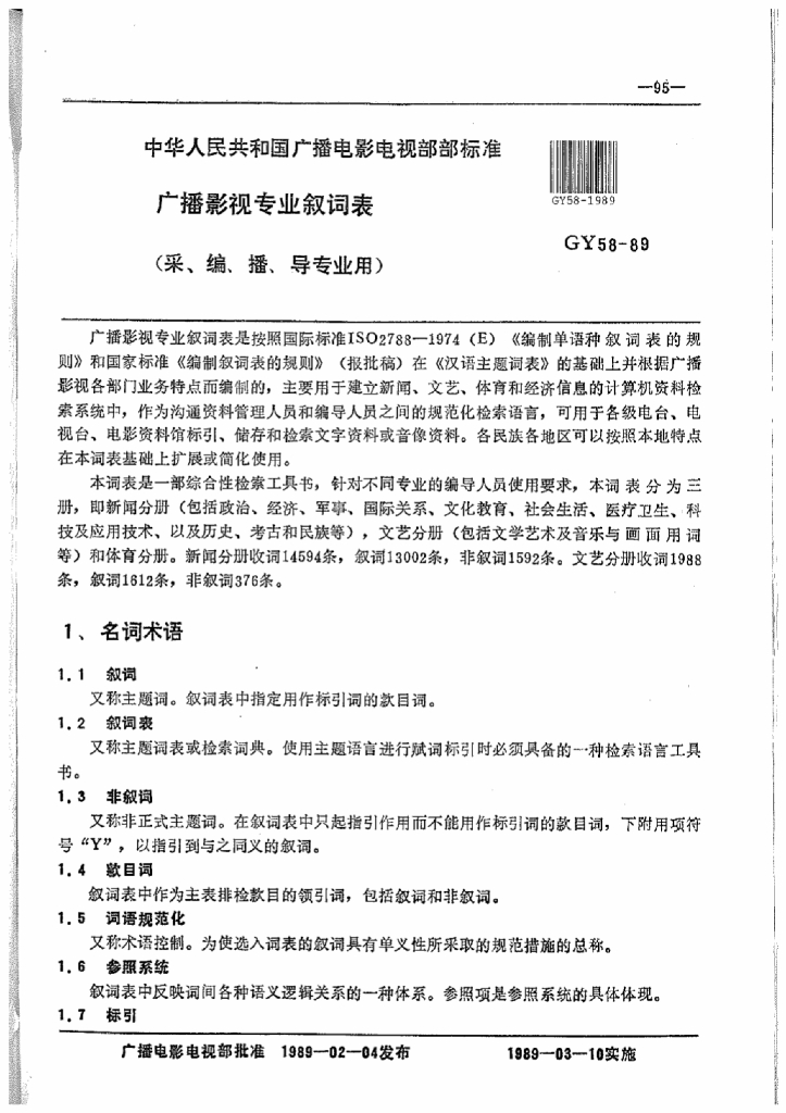 GY 58-1989 广播影视专业叙词表(采、编、播、导专业用)