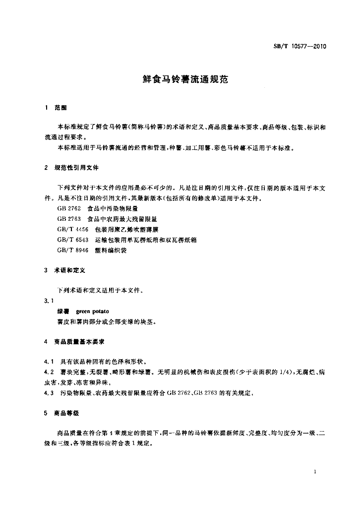 SB/T 10577-2010 鲜食马铃薯流通规范